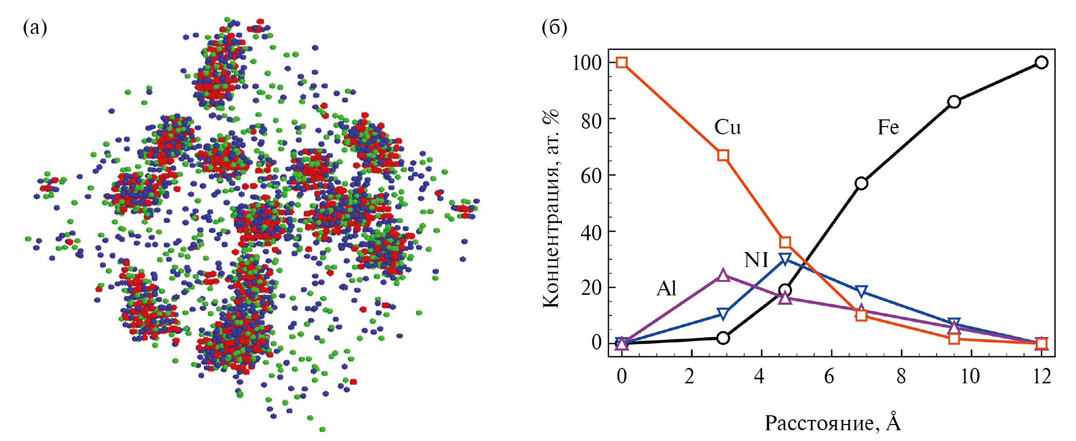 В работах [52, 53], с использованием комплексного MD+MC-подхода, включающего Монте-Карло и молекулярно-динамическое моделирование, исследована кинетика формирования выделений в многокомпонентном низколегированном сплаве Fe–1.5 ат.%Cu–2.0 ат.%Ni–1.5 ат.%Al. Установлено, что в процессе отжига на поверхности наночастиц Cu происходит образование слоя, обогащенного атомами Al и Ni (рис. 4).