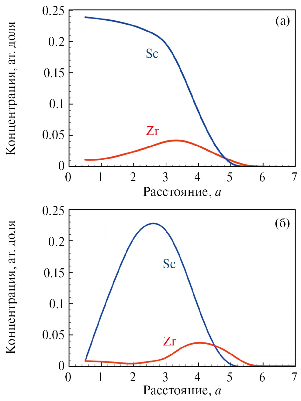 Рис. 5. Усредненная локальная концентрация Sc и Zr, формирующаяся при отжиге при T = 800 K в зависимости от расстояния до центра выделения (a –параметр решетки) [33]. На фрагментах (а) и (б) все параметры одинаковы за исключением Г2 — частоты обмена атомов по вторым соседям, которая в 10 раз больше на фрагменте (a), по сравнению с (б).