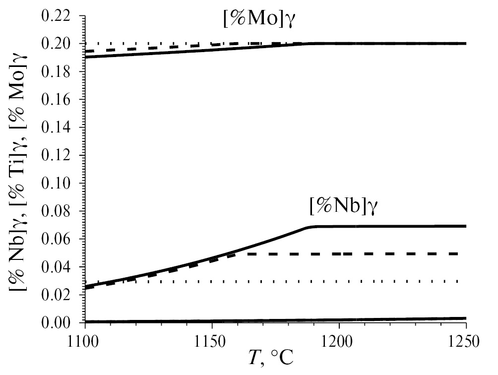 Молибден, хоть и входит в заметном количестве в состав одной из карбонитридных фаз, по большей части находится в твердом растворе. Марганец и кремний тоже практически не связываются в карбонитриды и остаются в твердом растворе. Так как углерод преимущественно связывается только в (Mo, Nb)C, при полном растворении данной фазы его количество в аустените (как видно из рис. 3) соответствует таковому во всем сплаве.