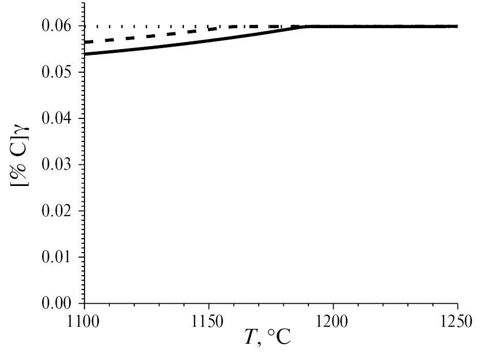 Рис. 3. Расчетная зависимость количества C в аустените от температуры для различного содержания Nb в стали 06Г2МБ. Пунктир — 0.3% Nb, штриховая линия – 0.5% Nb, сплошная — 0.7% Nb.