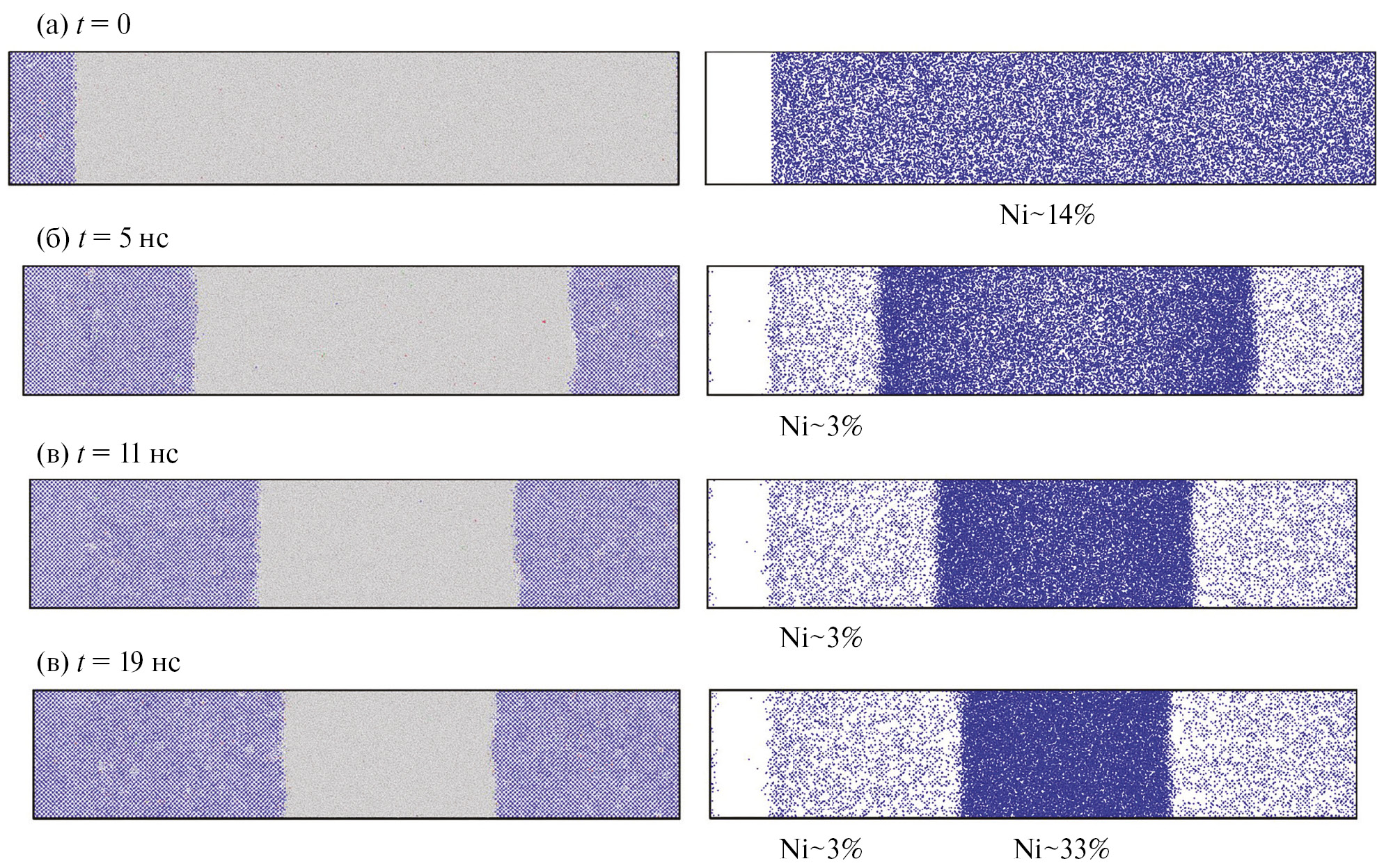 Рис. 3. Движение границы ОЦК-кристалл/жидкость (колонка слева — синим цветом показан ОЦК-кристалл, серым — расплав) и концентрация никеля (колонка справа — синим цветом показаны атомы никеля, атомы молибдена не показаны) в образце на различные моменты времени: а – начало расчета t = 0; б – момент времени t = 5 нс; в – момент времени t = 11 нс; г – момент окончания расчета, соответствующий t = 19 нс.