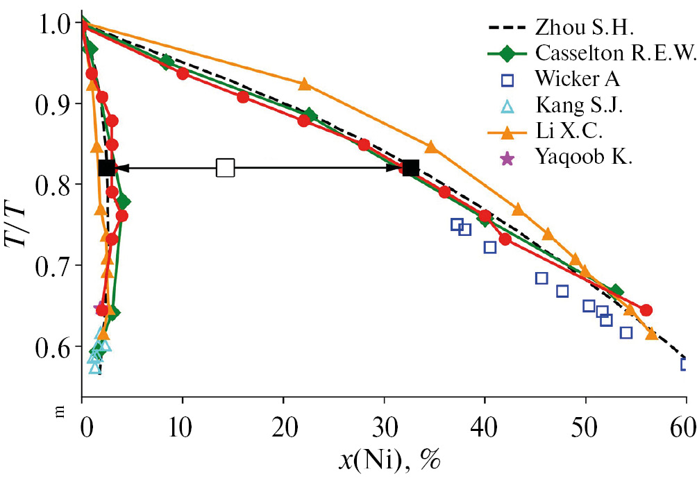 С использованием CMI-метода были определены фазовые диаграммы рассматриваемых бинарных систем. На рис. 2 приведена фазовая диаграмма бинарного сплава Cu–Ni, рассчитанная CMI-методом, и известные экспериментальные данные по положению линий солидуса и ликвидуса [31–34]. Полученные результаты с высокой точностью воспроизводят результаты экспериментов. Данная методика позволяет с приемлемой точностью рассчитывать фазовые диаграммы бинарных сплавов даже с относительно небольшой разницей температур солидуса и ликвидуса.