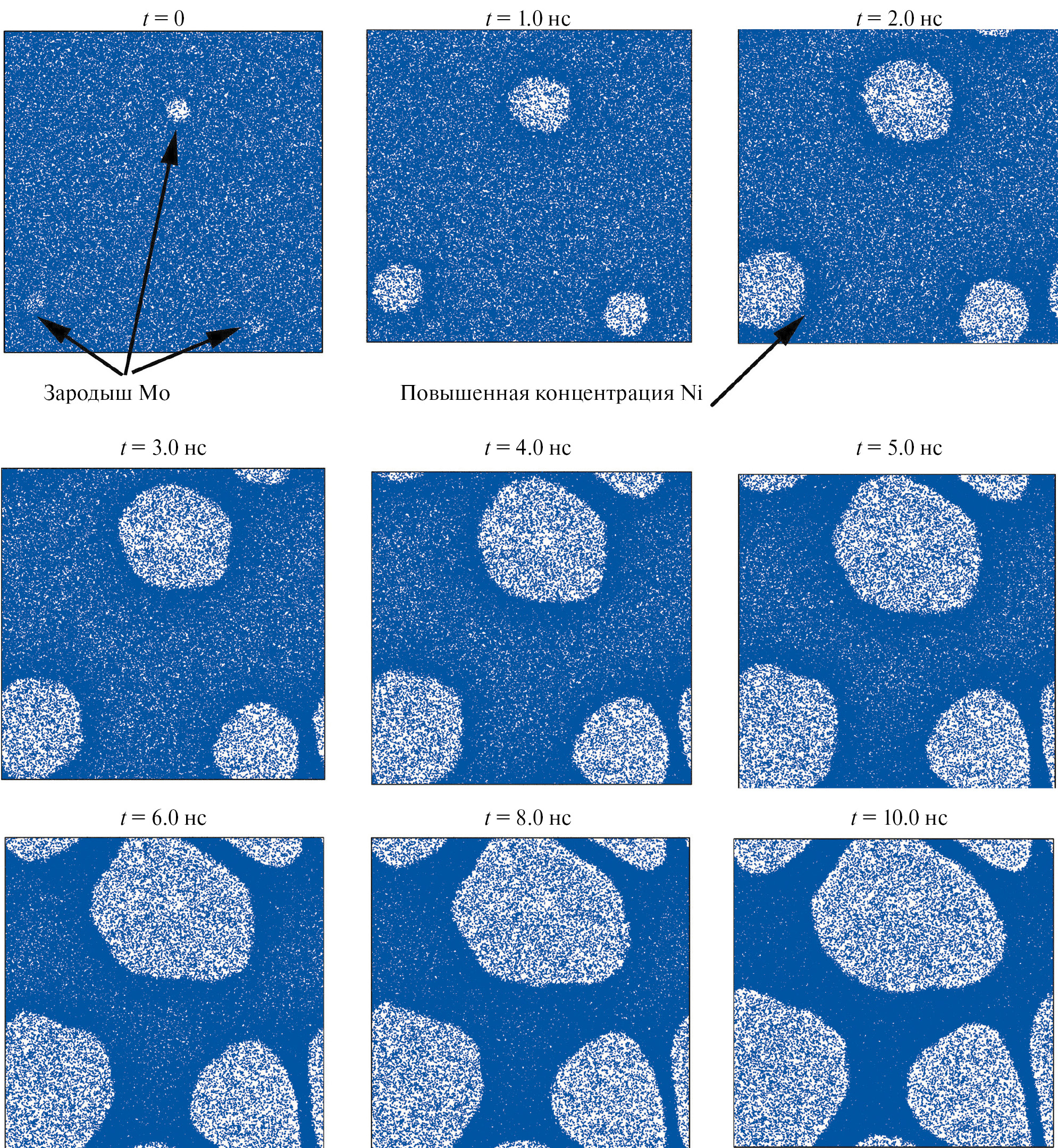 В настоящем разделе приводятся результаты крупномасштабного КМД-моделирования перераспределения компонент бинарного сплава Mo–Ni при его кристаллизации из расплава в квазидвумерной геометрии, т.е. в такой постановке, где размер вдоль одного направления значительно меньше вдоль двух других. В КМД-расчете со SNAP-потенциалом использована система с размерами ~ 51 нм × 51 нм × 5.1 нм в периодических граничных условиях во всех направлениях, состоящая из 819 200 атомов. Как и в предыдущем разделе, среднее содержание никеля в системе задавали равным 14 ат. %. С помощью термостата и баростата Нозье–Гувера [29, 30] в системе поддерживали требуемую температуру и давление, близкое к нулю. На начальном подготовительном этапе система была прогрета значительно выше температуры плавления молибдена и получен расплав с равномерным распределением атомов никеля в нем. Далее система была термализована при нулевом давлении и температуре T = 2800 К. В расплаве были искусственно созданы три относительно небольших (~ 2.5 нм в диаметре) квазисферических зародыша ОЦК-фазы чистого молибдена (рис. 6). Так как выбранные параметры системы (температура и концентрация никеля в расплаве) находятся на фазовой диаграмме значительно ниже линии ликвидуса, то зародыши чистого ОЦК-молибдена начинают постепенно расти. Из-за значительного отличия линий солидуса и ликвидуса при их росте происходит перераспределение компонент сплава, подобно тому, как это было в квазиодномерном случае. При достижении равновесия концентраций компонент в кристалле и в расплаве, соответствующих значениям концентраций на линиях солидуса и ликвидуса при данной температуре, рост кристаллитов прекращается. На рис. 6 представлены состояния системы (показаны только атомы никеля, причем в закристаллизовавшихся областях содержание никеля заметно ниже) на разные моменты времени (разные этапы роста ОЦК-кристаллитов).