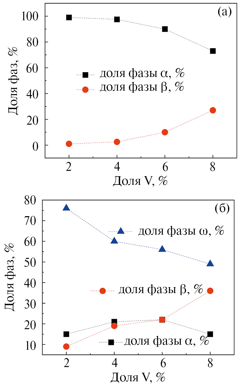 Рис. 1. Объемные доли α-, β- и ω-фаз в сплавах Ti–V после отжига (а) и после КВД (б).Исходя из фазовой диаграммы системы Ti–V, при увеличении концентрации ванадия в сплаве должна линейно увеличиваться доля остаточной β-Ti-фазы. В нашем исследовании мы наблюдали распределение фаз, изображенное на рис. 1а. После КВД образуется также и ω-Ti-фаза, доля которой составляет от 76 до 49 %.
