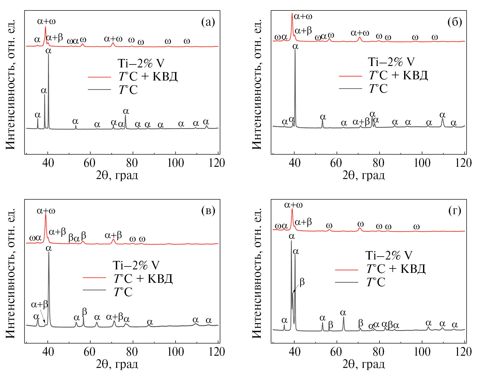 Рис. 2. Рентгенограммы сплавов Ti–2 вес. % V (а), Ti–4 вес. % V (б), Ti–6 вес. % V (в), Ti–8 вес. % V (г), где черные линии соответствуют отожженным образцам, красные — образцам после КВД.