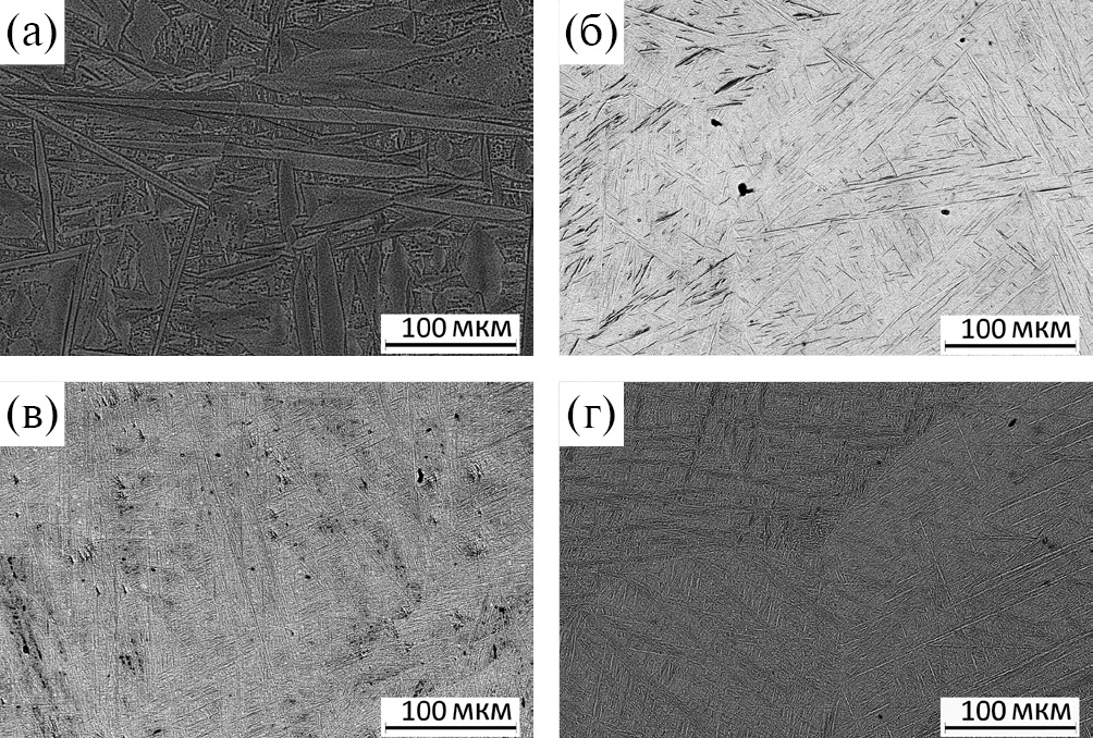 Все сплавы после закалки имеют мартенситный (игольчатый) тип структуры, в которых сложно обнаружить границу раздела между зернами-матрицами (рис. 3). Наиболее явные границы между зернами-матрицами имеет сплав, содержащий 8 вес. % V, рис. 3г. В этом сплаве имеется два типа различимых пластин: светлые иголки и темные пластины.