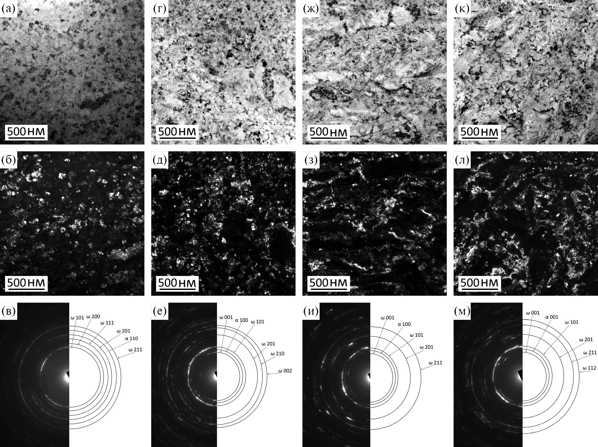 Риc. 4. ПЭМ-изображения микроструктуры сплавов в светлопольном (сверху), темнопольном (в центре) виде и их электронограммы (снизу) Ti–2 вес. % V (а–в), Ti–4 вес. % V (г–е), Ti–6 вес. % V (ж–и), Ti–8 вес. % V (к–м), после КВД.