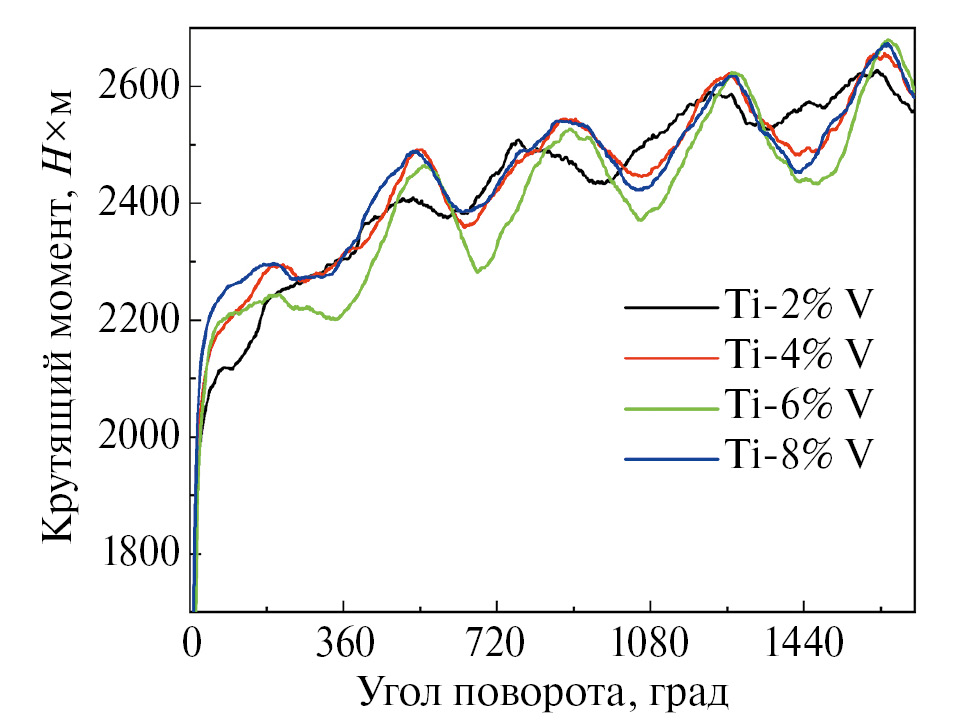 Несмотря на то что ванадий является частым элементом легирования титана, например, сплав Ti–6Al–4V, мы не нашли в литературе работ по изучению влияния КВД-обработки бинарных сплавов Ti–V. Известно, однако, что при легировании титана ванадием одновременно повышаются и прочность, и пластичность сплава [26]. Ванадий имеет почти равный атомный размер с титаном, а его решетка в обычном состоянии – объемно-центрированная кубическая (ОЦК), что делает его изоморфным бета-стабилизатором титана. Кроме того, легирование ванадием приводит к снижению температуры бета-превращения в титановых сплавах, и при достаточной концентрации позволяет сохранить бета-фазу после закалки сплава [26–30].