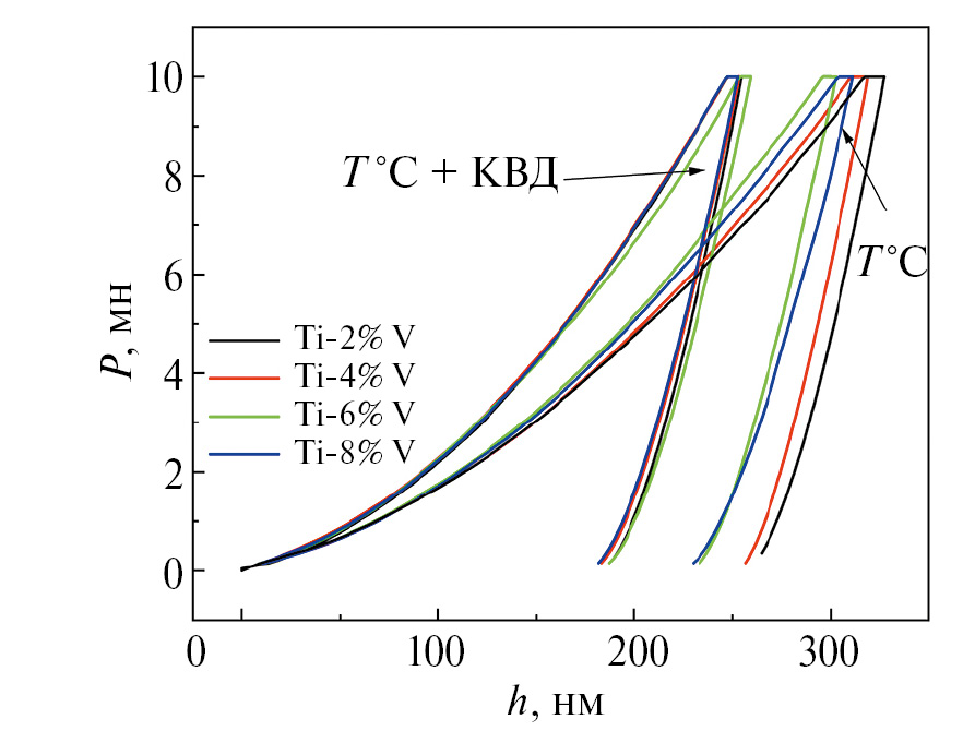 Рис. 6. Кривые P–h-сплавов Ti–V после отжигов и после КВД, где Т°C соответствует 1000°C.