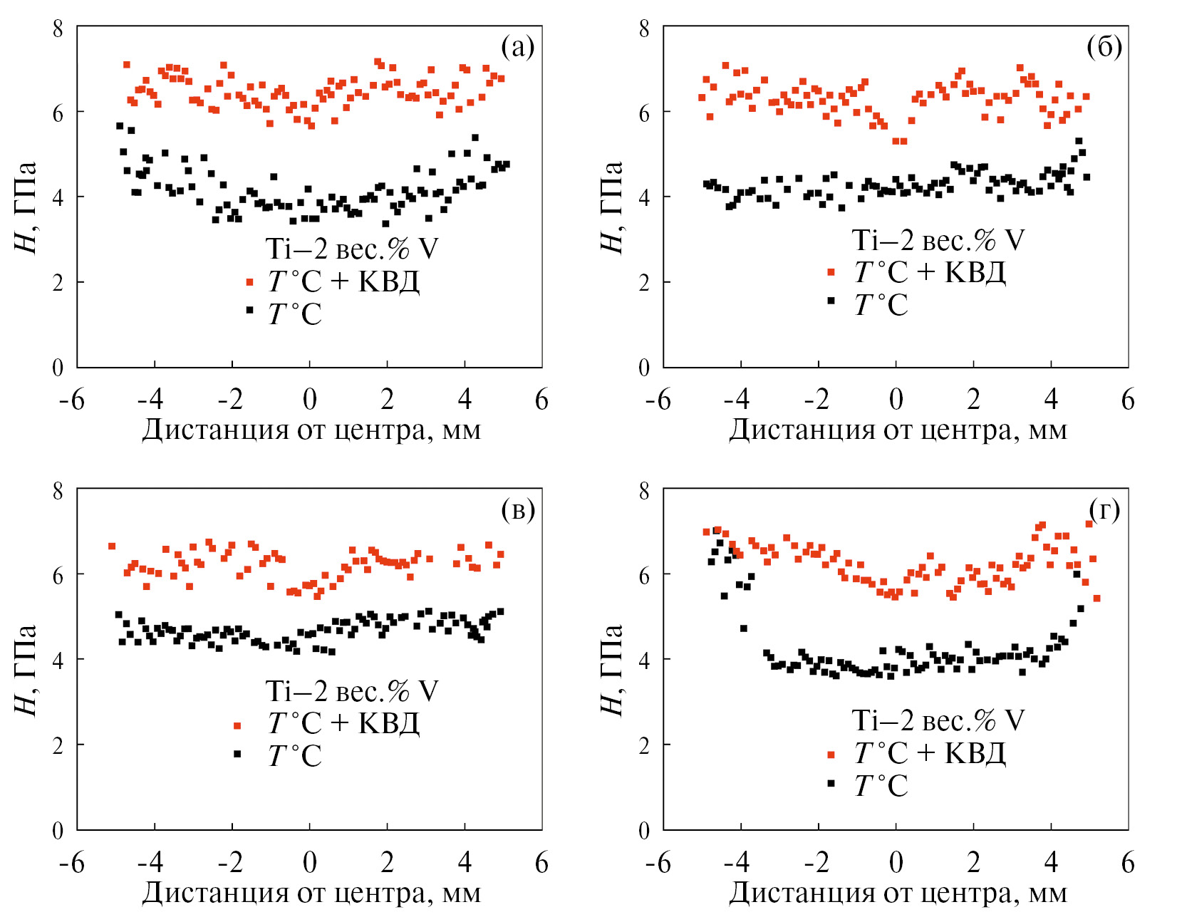 Рис. 7. Твердость сплавов при наноиндентировании в зависимости от расстояния точки измерения от центра образца, для отожженных (черные квадраты) и обработанных КВД (красные квадраты) образцов Ti–2 вес. % V (а), Ti–4 вес. % V (б), Ti–6 вес. % V (в), Ti–8 вес. % V (г).