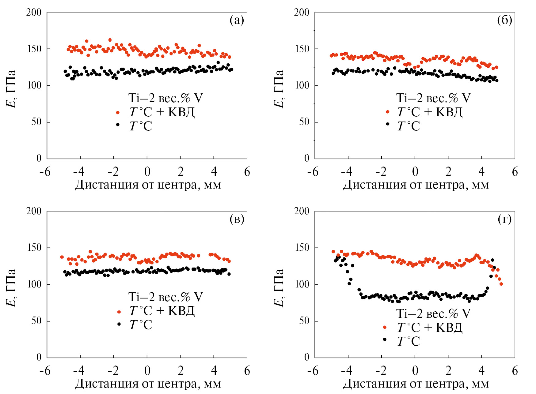 Рис. 8. Модуль упругости сплавов при наноиндентировании в зависимости от расстояния точки измерения от центра образца, для отожженных (черные кружки) и обработанных КВД (красные кружки) образцов Ti–2 вес. % V (а), Ti–4 вес. % V (б), Ti–6 вес. % V (в), Ti–8 вес. % V (г).