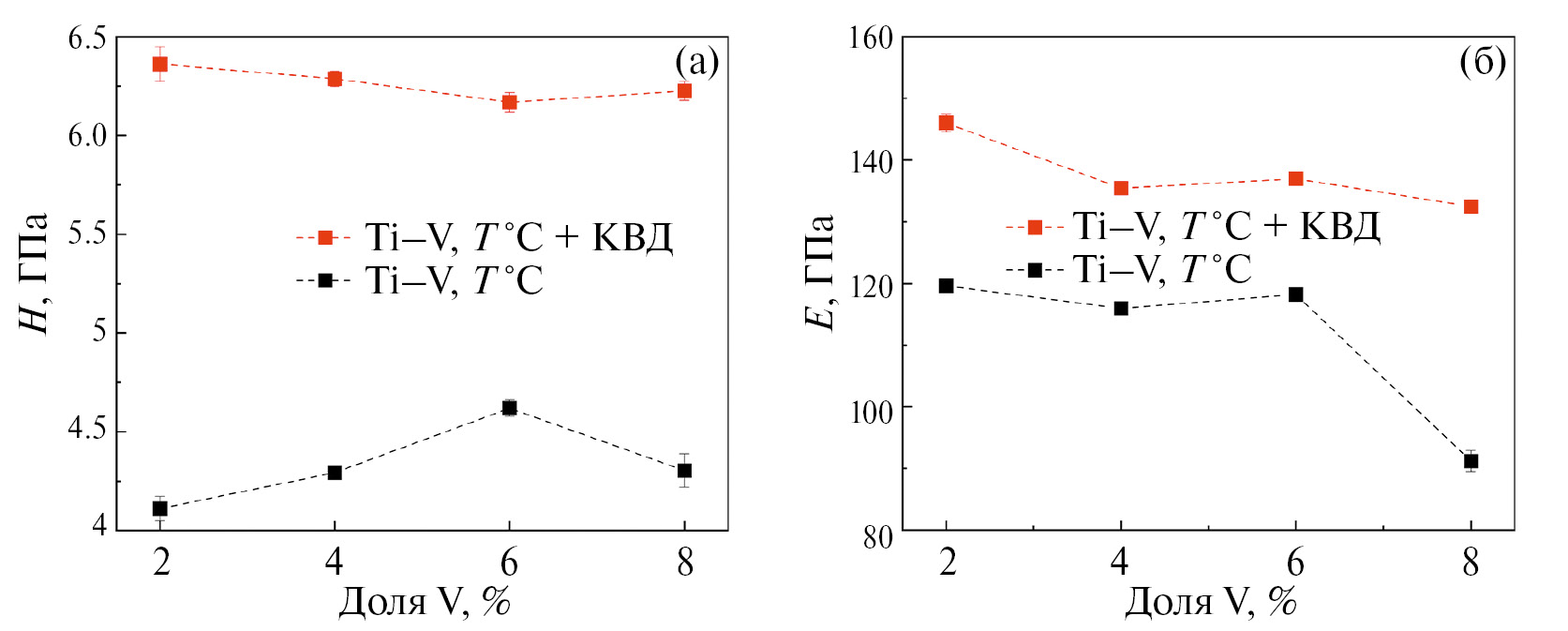 Рис. 9. Средние значения нанотвердости (а) и модуля упругости (б) для отожженных (черные символы) и обработанных КВД (красные символы ) исследуемых образцов Ti–V.