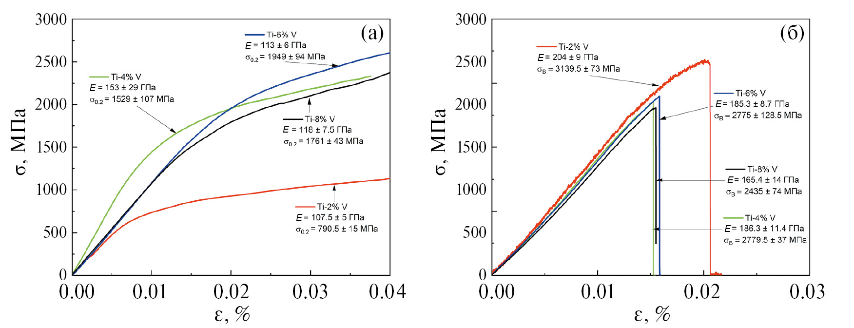 - Изученные сплавы Ti–V, подвергнутые КВД-обработке, имеют близкие значения деформация.
