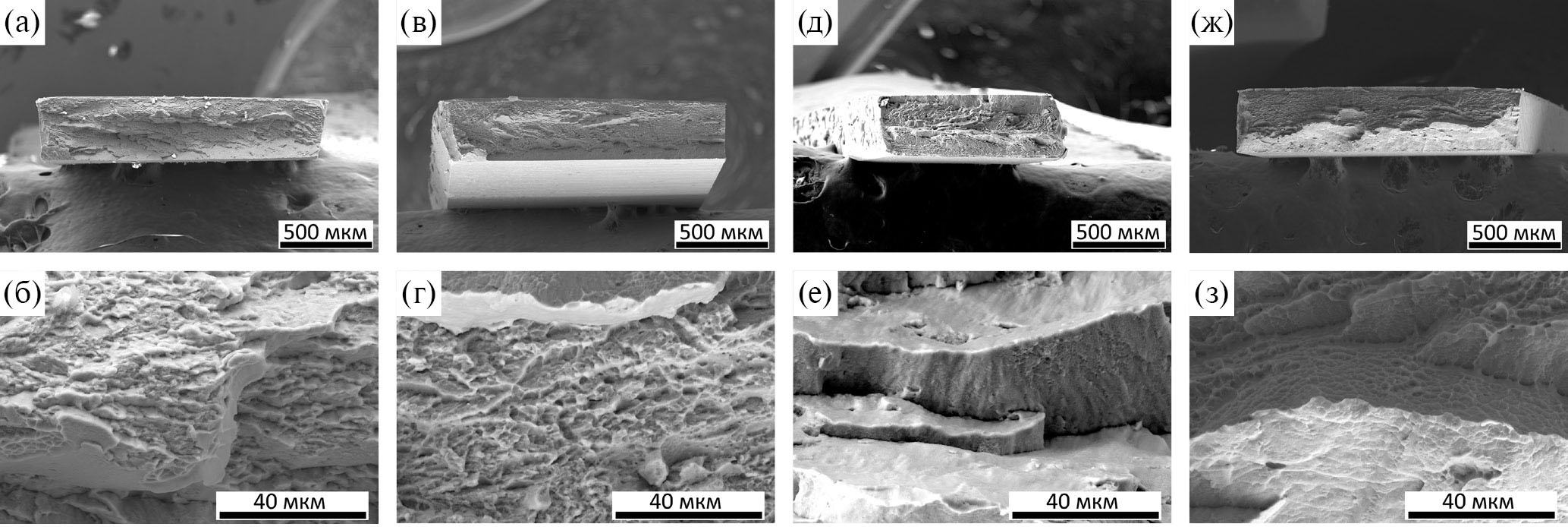 Рис. 12. Фотографии изломов образцов после КВД-обработки, образовавшихся при испытаниях на трехточечный изгиб: Ti–2 вес.% V (а, б), Ti–4 вес.% V (в, г), Ti–6 вес.% V (д, е) и Ti–8 вес.% V (ж, з).