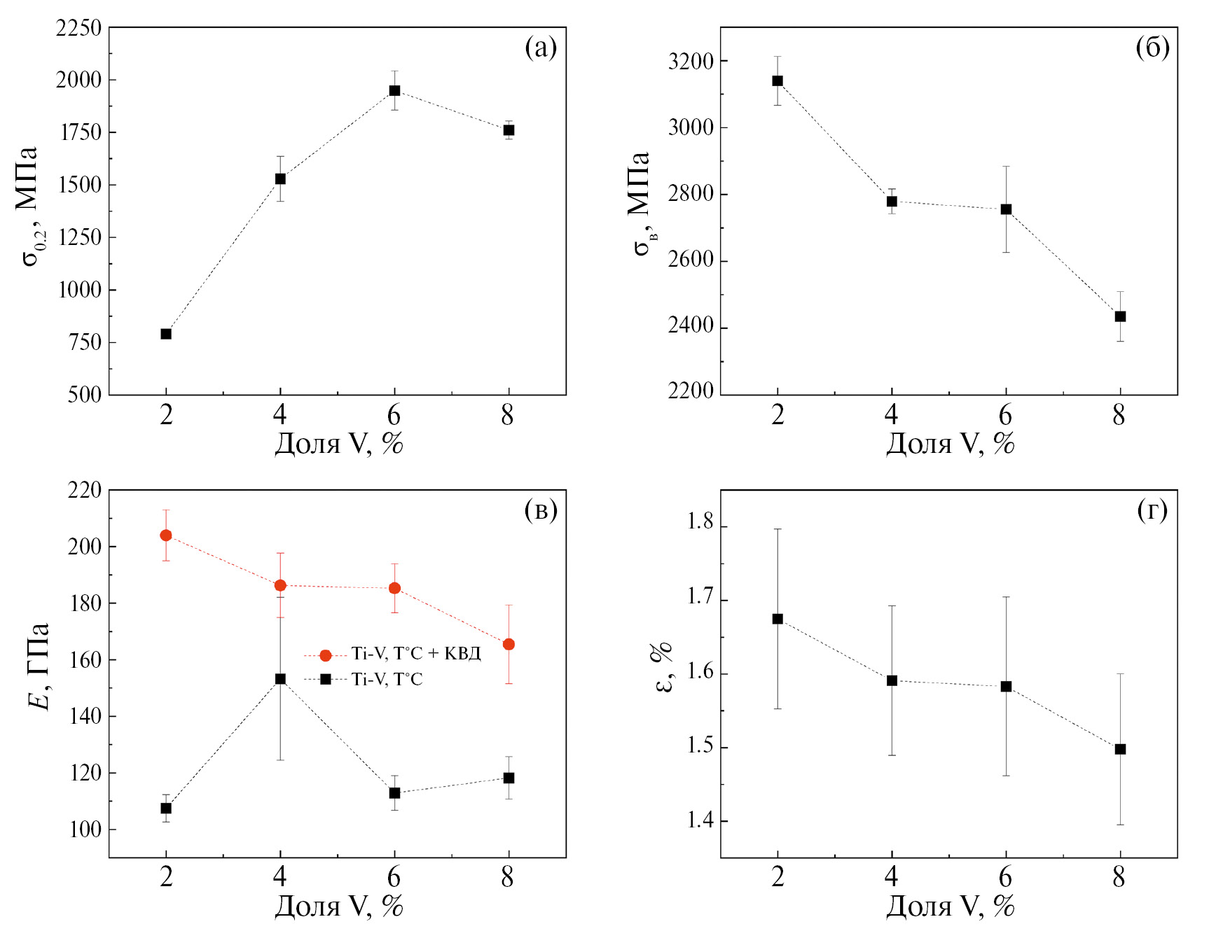 Рис. 14. Средние значения (а) условного предела текучести σ0.2 отожженных образцов, (б) предела прочности образцов σB после КВД, (в) модуля упругости на изгиб после отжигов и после КВД и (г) максимальной деформации перед разрушением образцов после КВД в зависимости от доли второго компонента (V) в сплаве.