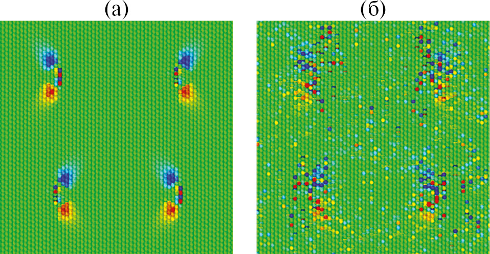 Рис. 1. Поле деформаций вокруг ядер дислокаций в чистом Fe (а) и в сплаве Fe–12%Cr (б).
