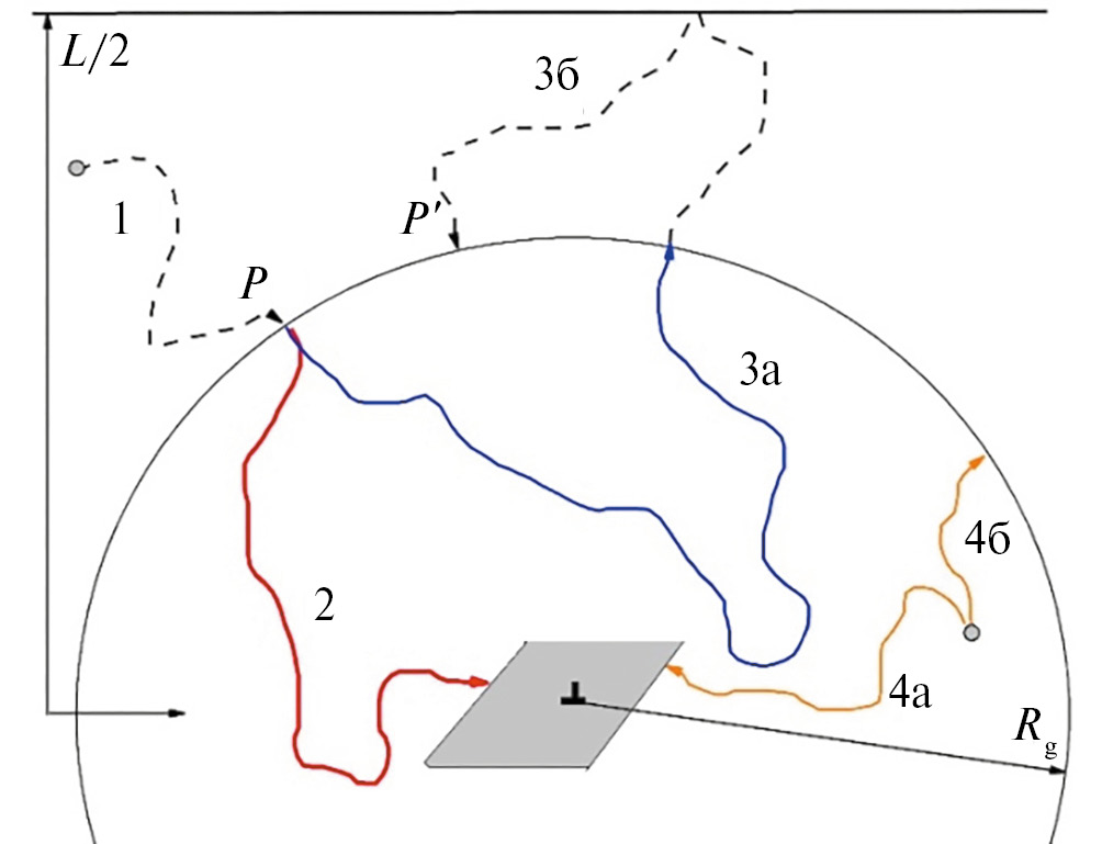 Процедура подсчета прыжков на траектории ТД типа 1 начинаются из распределенной равномерно случайной точки в нейтральной области и заканчивается после пересечения окружности радиусом . Таким образом, процесс поглощения ТД на радиусе рассматривали как нейтральный сток. Траектории 2 и 4 включали поглощение на ядре дислокации. Первые начинаются на окружности , вторые — из распределенной равномерно случайной точки внутри круга серой области. Траектории 3а и 3в являются циклическими, без поглощения, они начинающиеся и заканчивающая на окружности . И наконец, траектории типа 4а и 4в начинаются внутри круга с поглощением на дислокации или выходом из него. Их доля определяется отношением площадей . Траектории, достигающие внешней границы ячейки , испытывали отражение. Траектории каждого типа характеризуется средним числом прыжков до момента захвата, входа или выхода из “серой” зоны. Таким образом, вероятность отражения серым стоком определяется из значений среднего числа траекторий каждого типа.