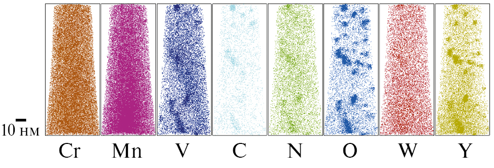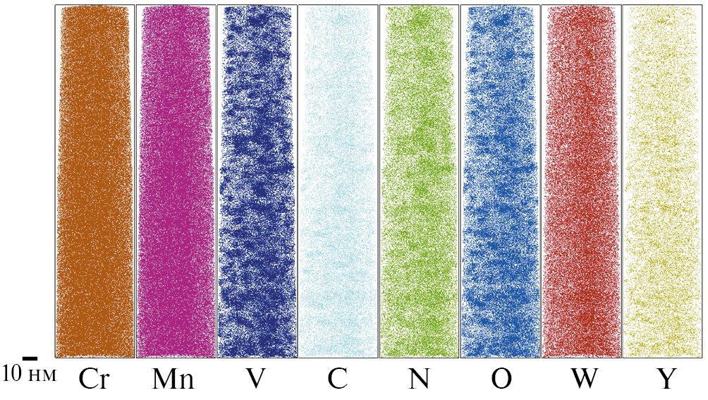 Сталь Eurofer ODS легирована V, 10Cr ODS содержит V и Ti, а сталь KP-3 ODS легирована Ti и Al. Содержание иттрия находится во всех сталях в диапазоне 0.13–0.17 ат. %, в то время как содержание кислорода представлено в достаточно широком диапазоне от 0.17 до 0.37 ат. %.