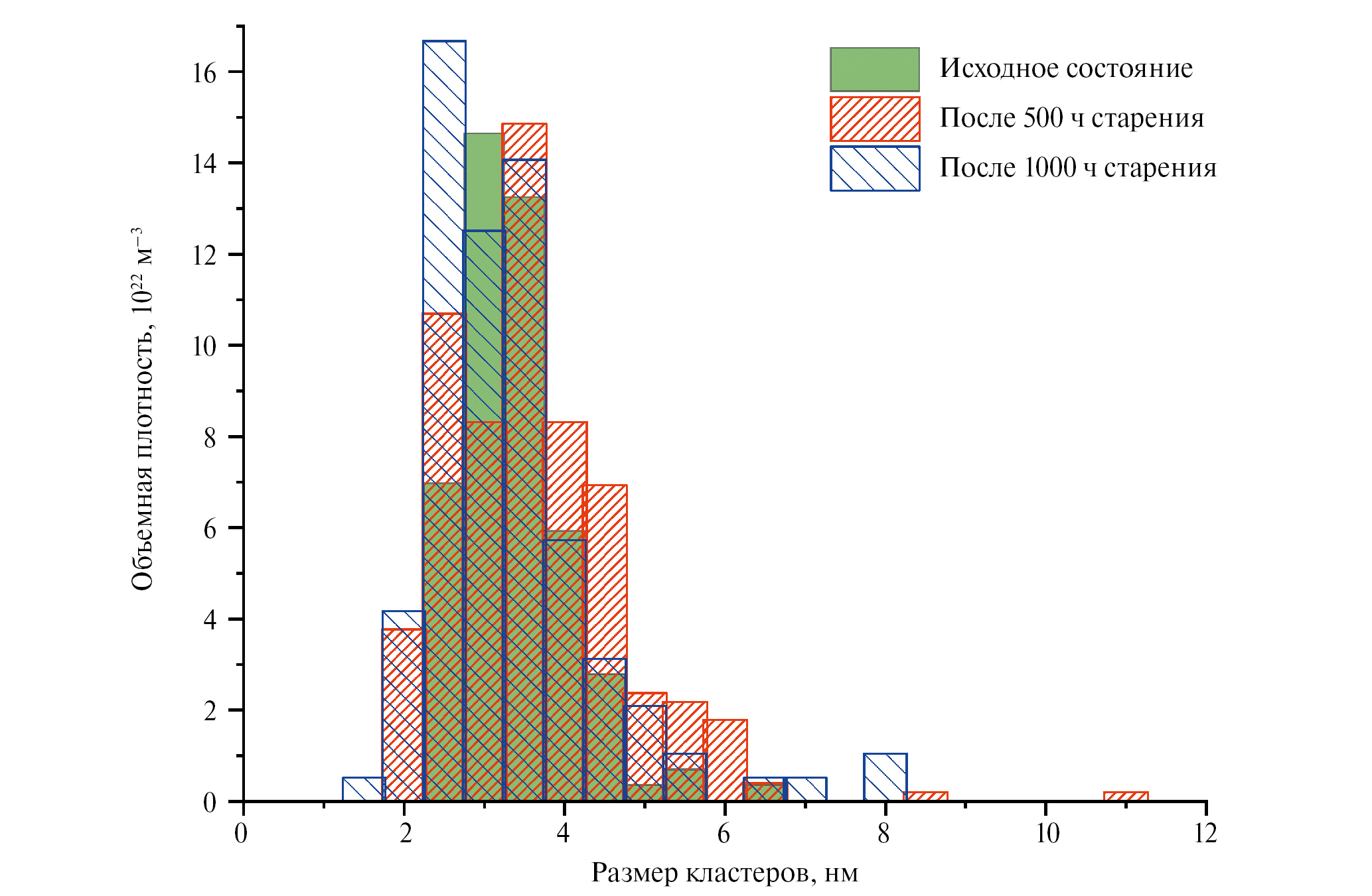Сравнение полученных данных после термического старения с данными для исходного состояния демонстрирует во всех сталях рост объемной плотности кластеров (при сохранении или росте их среднего размера) при старении в течение 500 ч, соответствующий стадии зарождения кластеров. В то время как после старения в течение 1000 ч обнаружено уменьшение объемной плотности, что соответствует стадии коалесценции. Данные закономерности также подтверждаются анализом изменения концентрации химических элементов в матрице.