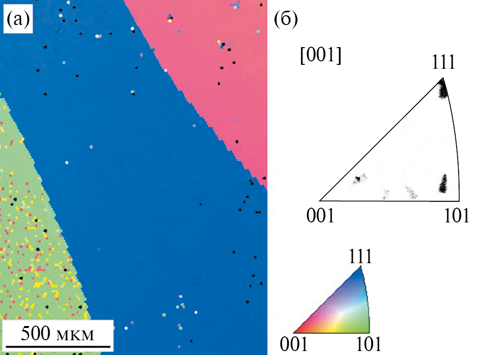 Рис. 1. Исходная структура исследованного ванадия: а – ориентационная карта в цветах обратной полюсной фигуры (ОПФ); б – ОПФ. Данные EBSD-анализа.