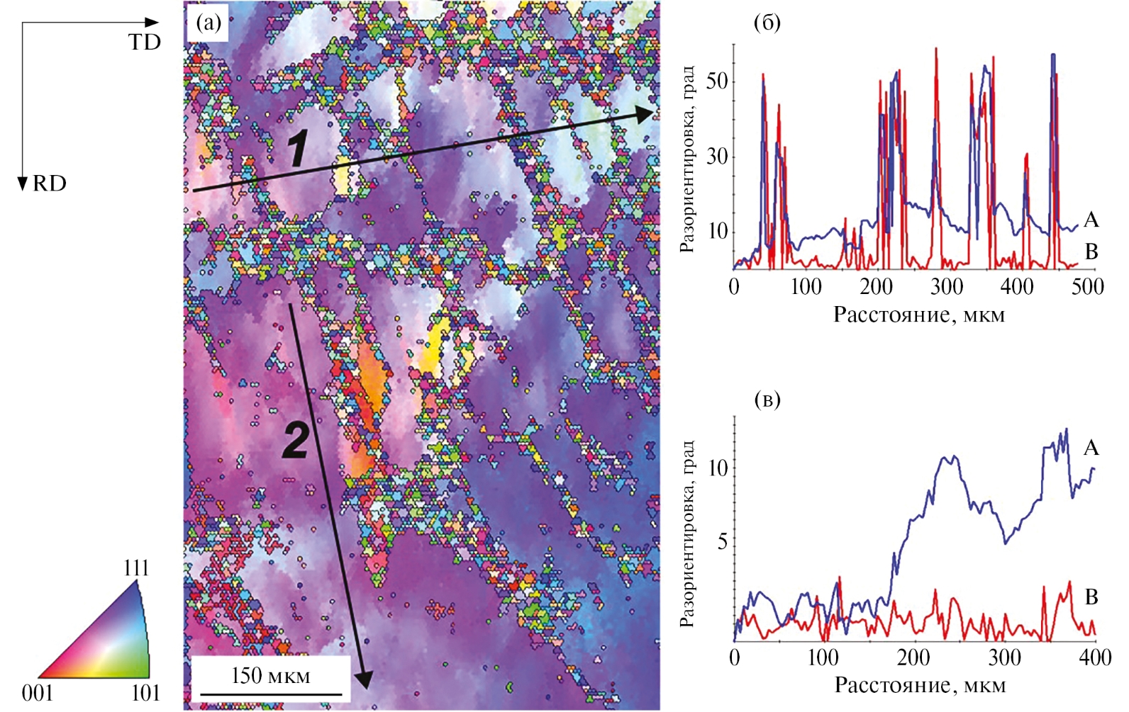 Рис. 3. Микроструктура ванадия, деформированного осадкой (е = 0.4): а – ориентационная карта в цветах ОПФ с нанесенной схемой БУГ; б, в – изменение ориентировки вдоль линий сканирования 1 и 2 соответственно, A - разориентировка относительно исходной точки; B - разориентировка соседних точек. СЭМ.