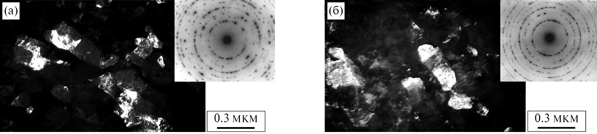 Рис. 7. СМК-структура ванадия и микродифракции (на вставках): а – е = 7.8 (3 об.); б – е = 9.8 (10 об.); ПЭМ-темнопольные изображения в рефлексе типа (110).