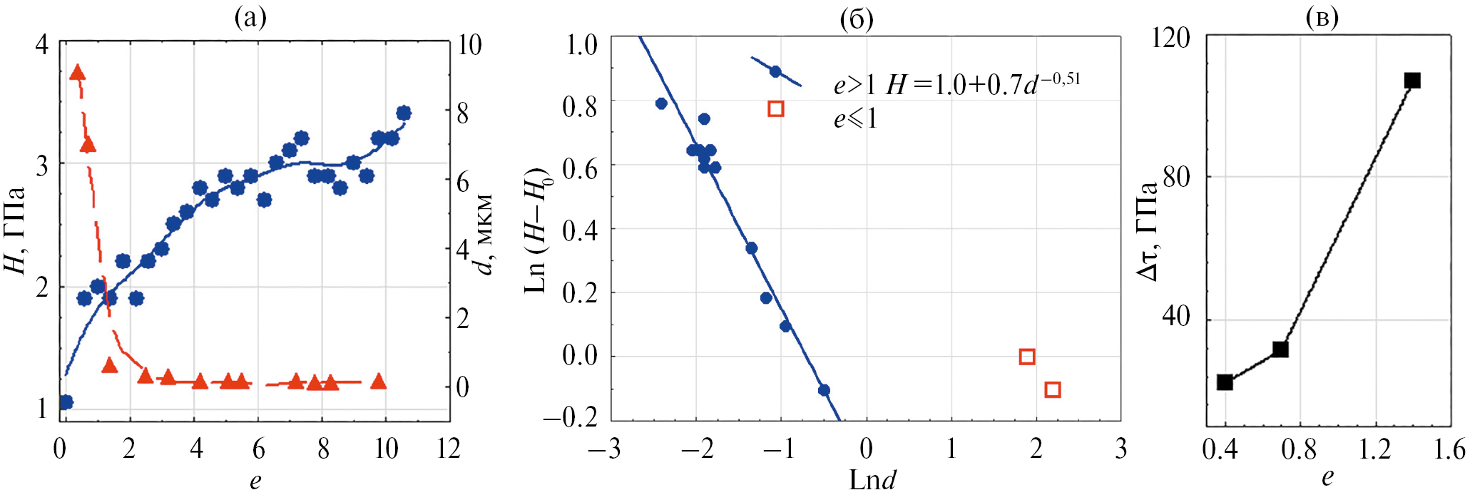 Рис. 9. Зависимость твердости (●) и среднего размера элементов структуры (▲) ванадия от истинной деформации (а) и определение вкладов в его упрочнение (б, в); б – установление параметров соотношения Холла-Петча, в – дислокационное упрочнение.