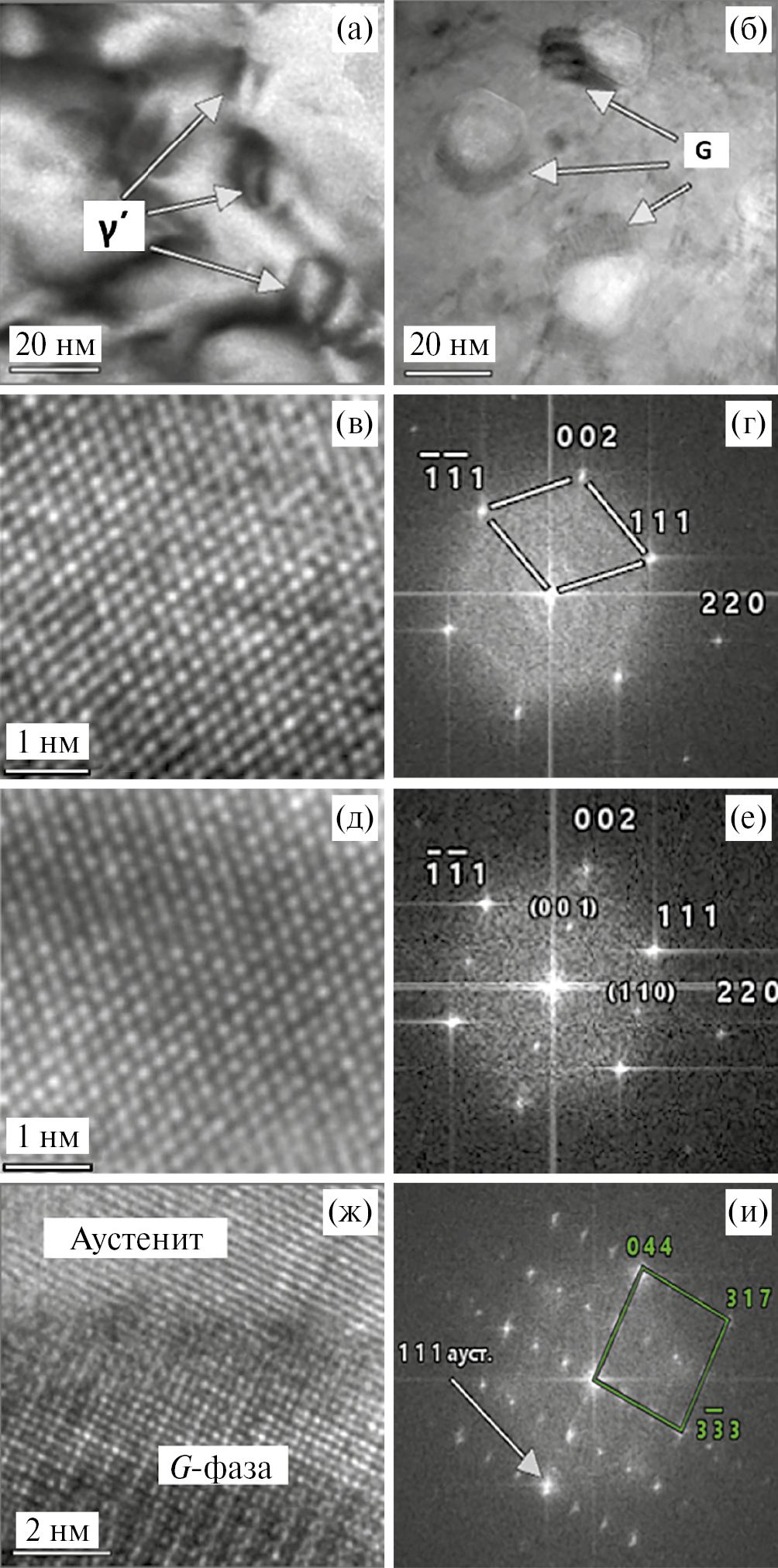 Рис. 4. Морфология интерметаллидов в объеме зерен в стали Cr16–Ni19 х.д. после облучения, Тобл. ~ 450°С, G ~ 1.3 ∙ 10–6 сна/с: (а) контраст типа “кофейного зерна” на когерентных выделениях γ'- фазы; (б) выделения G-фазы на вакансионных порах; (в, г) прямое разрешение решетки аустенита и соответствующее ФП с расшифровкой; (д, е) прямое разрешение решетки на частице γ' и соответствующее ФП с расшифровкой, видны запрещенные для ГЦК-решетки рефлексы (в круглых скобках); (ж, и) прямое разрешение решетки в окрестности межфазной границы и соответствующее ФП с расшифровкой, плоскости {022} G-фазы параллельны плоскостям {111} аустенита.