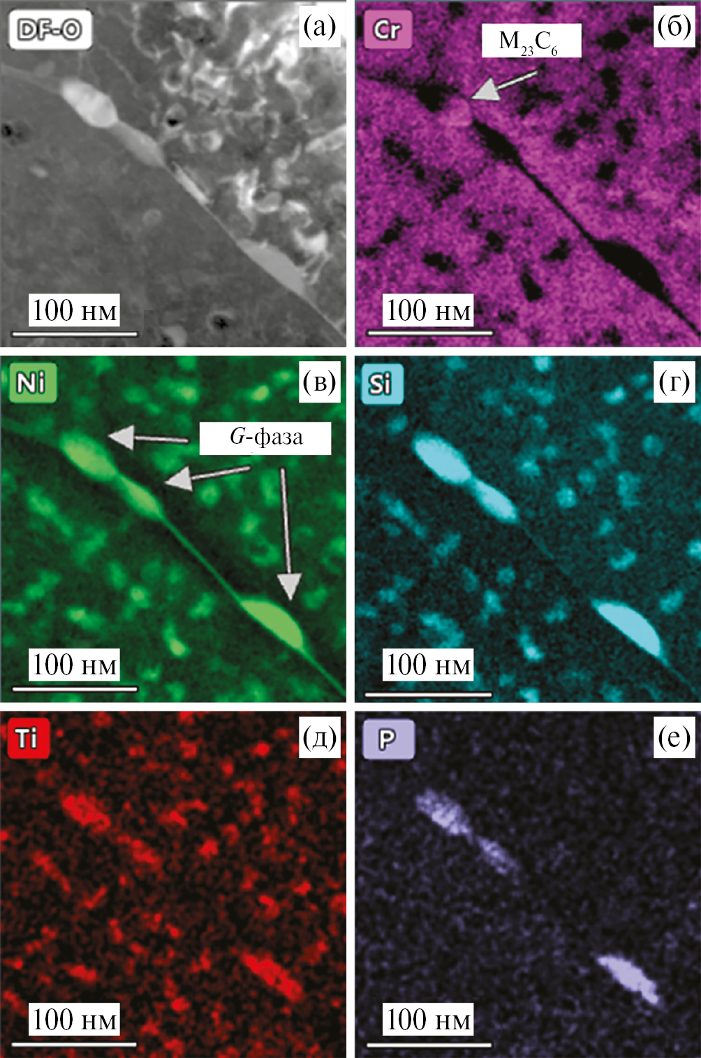 Рис. 13. Морфология выделений в стали типа Cr16–Ni19 х.д., характерная для нижнего края высокотемпературного диапазона облучения, Тобл. ~ 570°С, G ~ 1.3 ∙ 10–6 сна/с: (а) светлопольное STEM-изображение, отмечены выделения τ-карбида, фосфиды М2Р и петли Франка (ДУ); (б–г) карты распределения Cr, Ni, Ti. Отмечены мелкодисперсные частицы Ni3Ti и G-фазы в конгломератах с τ-карбидами; (д, е) профили распределения элементов Cr, Ni, Si, Mo, Ti, P через трехслойный конгломерат τ + G + τ и фосфид М2Р, обогащенный Si и Ti.