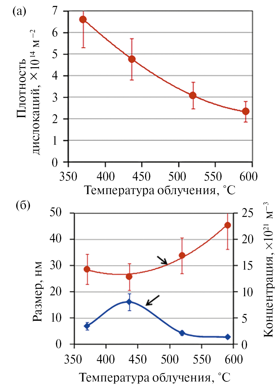 С ростом температуры облучения дислокационная структура эволюционирует от равномерно распределенной сетки дислокаций к образованию дислокационных стенок и формированию вторичной ячеистой структуры. Сначала в окрестности границ зерен наблюдаются локально разориентированные области, обусловленные процессами полигонизации, которые с ростом температуры усиливаются, захватывая весь объем зерна и формируя субзеренную структуру. Средняя плотность внутризеренных дислокаций с ростом температуры облучения монотонно снижается (рис. 16а).