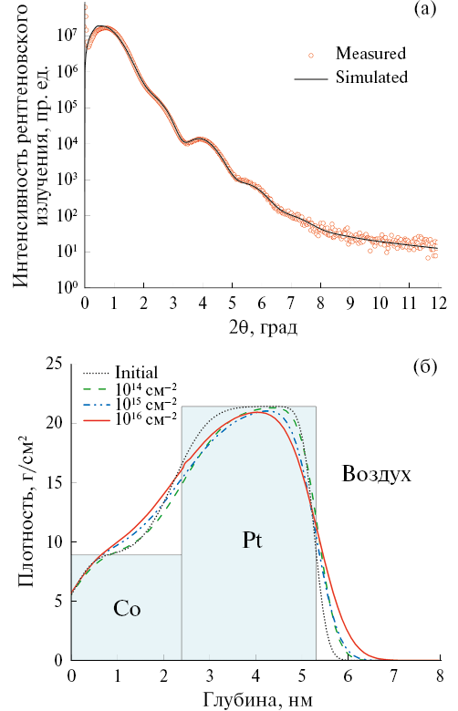 Структурные исследования проводили методом МУРР на рентгеновском дифрактометре Bruker D8 Discover (оборудование ЦКП “Физика и технология микро- и наноструктур” ИФМ РАН). Для определения структурных параметров решали обратную задачу метода МУРР путем варьирования параметров пробной модели: плотности и толщины слоев, ширины интерфейсов между ними. Расчет модельной кривой рефлектометрии и ее подгонка к экспериментальной проводили с использованием программного комплекса DIFFRAC.Leptos [16]. Плотности слоев Co и Pt оказались близки к табличным и не варьировались при подгонке. Для моделирования переходных слоев использовали функцию ошибок для гауссового распределения со стандартным отклонением σ. Одновременно проводили моделирование процесса ионного облучения двухслойных структур Co/Pt в программном комплексе SRIM [17]. При моделировании использовали параметры, полученные методом МУРР для исходного образца. Результаты моделирования в SRIM представляли собой графики распределения перемещенных атомов, которые затем пересчитывали в графики концентраций с учетом флюенса, а потом и в графики плотности для удобства сравнения с данными МУРР. Ширину интерфейса на полученных графиках определяли по интервалу глубин Δz, на котором значение плотности на интерфейсе изменяется в пределах 16–84% от величины перепада плотностей между Со и Pt, что соответствует значению 2σ для функции ошибок.