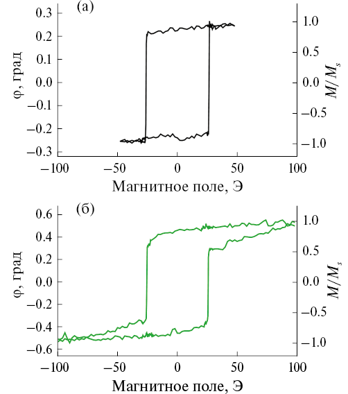 Исследование петель гистерезиса намагничивания пленок проводили методами оптической магнитометрии путем измерения меридионального магнитооптического эффекта Керра в геометрии скрещенных поляризаторов. Источником излучения служил высокостабилизированный He–Ne-лазер (λ = 632 нм) с модуляцией угла линейной поляризации в ячейке Фарадея. Синхронное детектирование мощности отраженного от образца и прошедшего через анализатор излучения проводили с использованием синхронного детектора SRC-830 (Stanford Research Systems). Поскольку образцы являются ультратонкими пленками, измеренные зависимости угла поворота плоскости поляризации от приложенного магнитного поля по форме и параметрам подобны петлям намагничивания образцов.