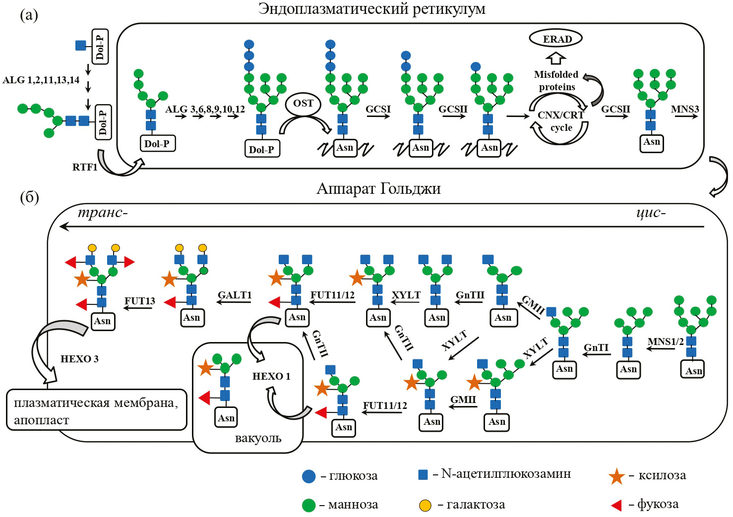 Ферменты, участвующие в формировании N-гликанов: ALG (Asn-linked glycosylation) – ферменты, катализирующие сборку долихолпиррофосфат-связанного олигосахарина; RTF1 – флиппаза; GCSI – α-глюкозидаза I; GCSII – α-глюкозидаза II; MNS3 – α-маннозидаза I эндоплазматического ретикулума; MNS1/2 – α-маннозидаза I аппарата Гольджи; GnTI – N-ацетилглюкозаминилтрансфераза I; GnTII – N-ацетилглюкозаминилтрансфераза II; GMII – α-маннозидаза II аппарата Гольджи; XYLT– β-1,2-ксилозилтрансфераза; FUT11/12 – коровая α-1,3-фукозилтрансфераза; FUT13 – α-1,4-фукозилтрансфераза; GALT1 – β-1,3-галактозилтрансфераза 1; HEXO1 – N-ацетилгексаминозидаза 1; HEXO 3 – N-ацетилгексаминозидаза 3.