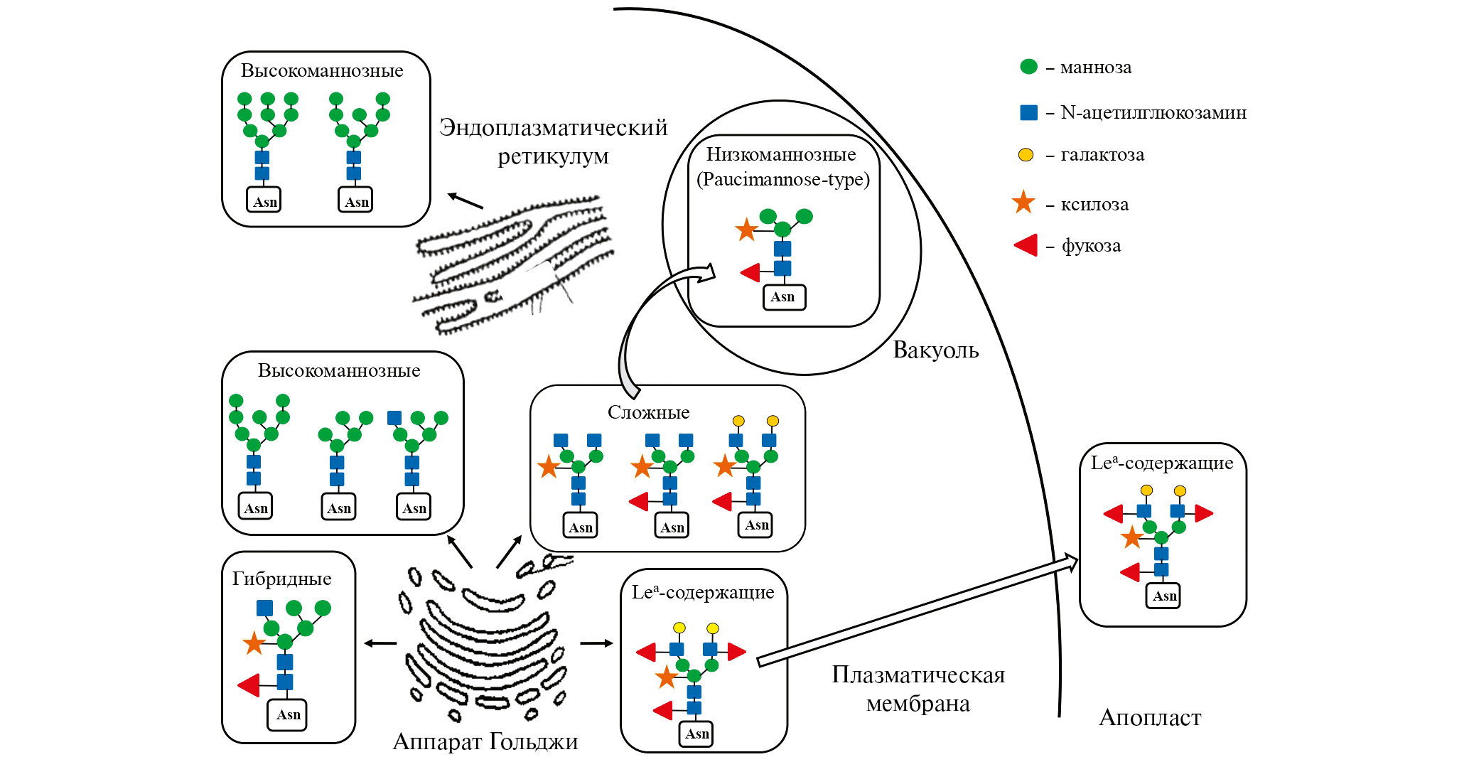 Таким образом, по модификации N-гликанов, декорирующих гликопротеин, можно определить его потенциальную локализацию в клетке растений.