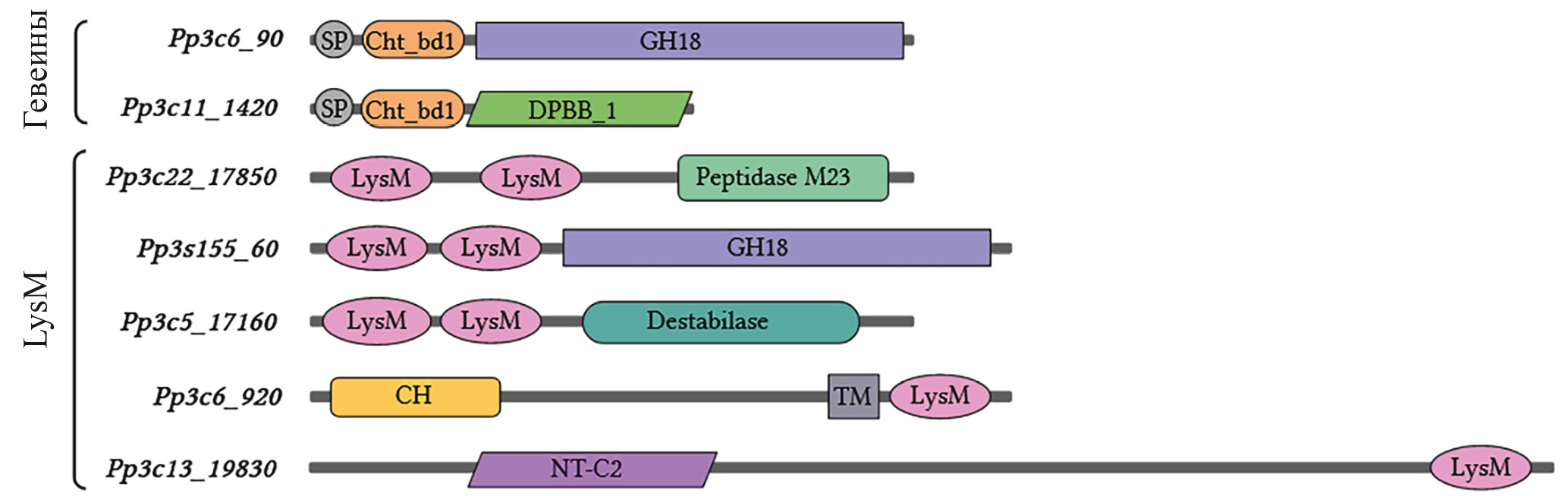 Рис. 1. Схематичное изображение специфичной доменной организации некоторых белков мха P. patens семейств гевеинов и LysM (номера соответствующих генов приведены слева). Во избежание путаницы названия всех доменов взяты из базы данных InterPro и поэтому приведены на английском. Обозначения: SP – сигнальный пептид; Cht_bd1 (сокращенно от chitin_bind_1) – хитин-связывающий домен гевеинов (PF00187); GH18 – домен хитиназы классов III и V (PF00704); DPBB_1 – домен двойного пси бета-бочонка (PF03330); LysM – лектиновый домен семейства LysM (PF01476); Peptidase M23 – домен пептидазы М23 (PF01551); Destabilase – домен глутаминазы (PF05497); СН – гомологичный кальпонину домен (PF00307); TM – трансмембранный домен; NT-C2 – N-концевой C2 домен (PF10358). Изображение было создано с помощью BioRender.com.