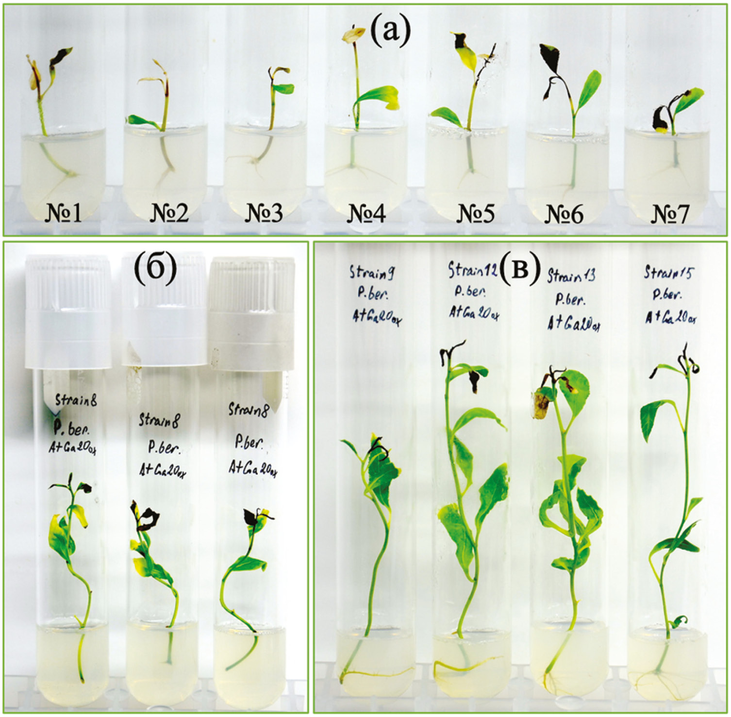 Рис. 5. Примеры некрозов некоторых линий трансгенных тополей на питательной среде с ИМК (0.15 мг/л). (а) – Некроз апикальной меристемы у линий № 1–7 после укоренения; (б) – Некроз листьев и апикальной меристемы без укоренения у линии № 8; (в) – Апикальный некроз у линий №№ 9, 12, 13 и 15 после укоренения и 30 дней роста.