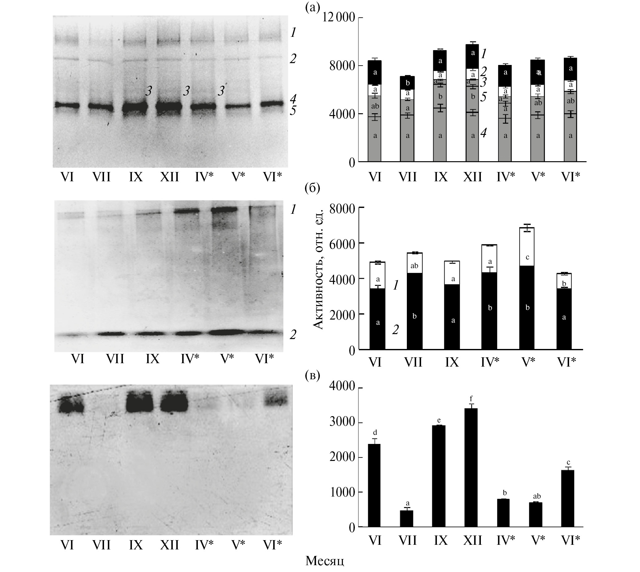 Рис. 1. Белковые профили изоформ супероксиддисмутазы (SOD) (а), аскорбатпероксидазы (APX) (б), каталазы (CAT) (в) (слева) и их относительная активность (справа) в разные периоды жизненного цикла листьев Ajuga reptans. Для SOD цифрами отмечены: 1 – Mn-содержащие изоформы (■), 2 – Fe-содержащие изоформы (□), 3–5 – Cu/Zn-содержащие изоформы (■). Для APX цифрами 1 и 2 отмечены изоформы APX-1 (□) и APX-2 (■) соответственно. Символом “*” отмечены данные для перезимовавших листьев. Представлены средние арифметические показатели относительной активности изоформ и их стандартные ошибки. Разные латинские буквы столбцов обозначают статистическую значимость различий между активностью изоформ ферментов в разные периоды жизненного цикла листьев (критерий Краскела-Уоллиса, P ≤ 0.05, n = 3–9).