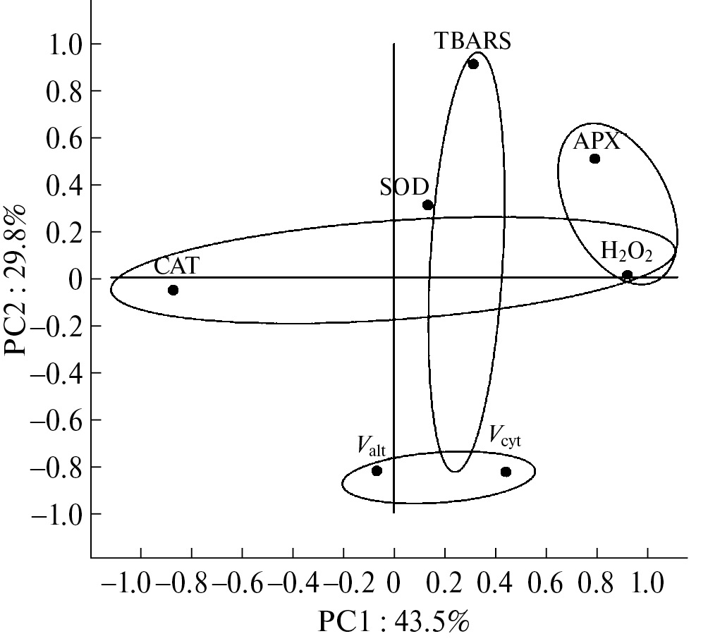 Рис. 3. Взаимосвязь показателей про-/антиоксидантного метаболизма и дыхания в листьях Ajuga reptans в течение их жизненного цикла: TBARS – содержание продуктов перекисного окисления липидов; SOD, APX, CAT – активность супероксиддисмутазы, аксорбатпероксидазы и каталазы соответственно; Vcyt и Valt – способность цитохромного и альтернативного дыхательных путей. Сплошной линией объединены взаимосвязанные показатели, вносящие основную нагрузку в компоненту 1 (PC1) и/или компоненту 2 (PC2). Результаты получены с применением анализа главных компонент. Распределение показателей между двумя компонентами (осями) обосновано высокой долей суммарной дисперсии переменных (73.3%), которую они описывают.