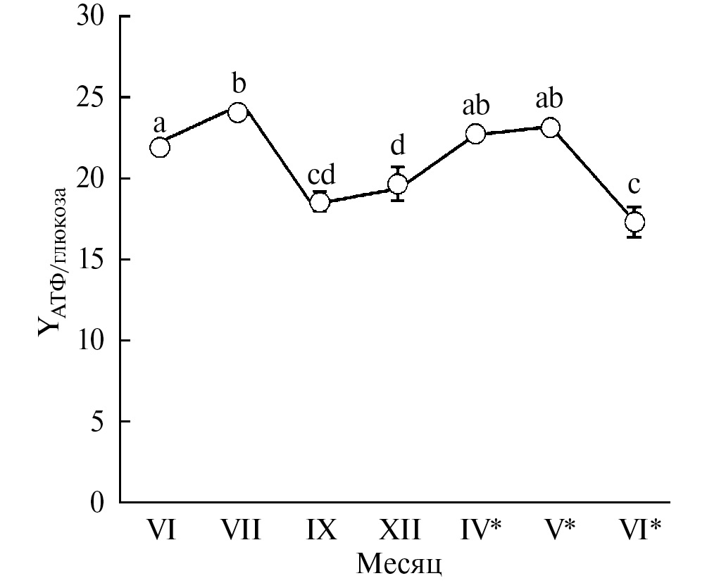 Рис. 4. Изменение энергетической эффективности дыхания (моль АТФ/моль глюкозы) листьев Ajuga reptans в течение их жизненного цикла. Символом “*” отмечены данные для перезимовавших листьев. Представлены средние арифметические значения и их стандартные ошибки. Разными латинскими буквами обозначены статистически значимые различия исследуемого показателя в течение года (ANOVA, критерий Дункана, n = 5‒10, Р ≤ 0.05).