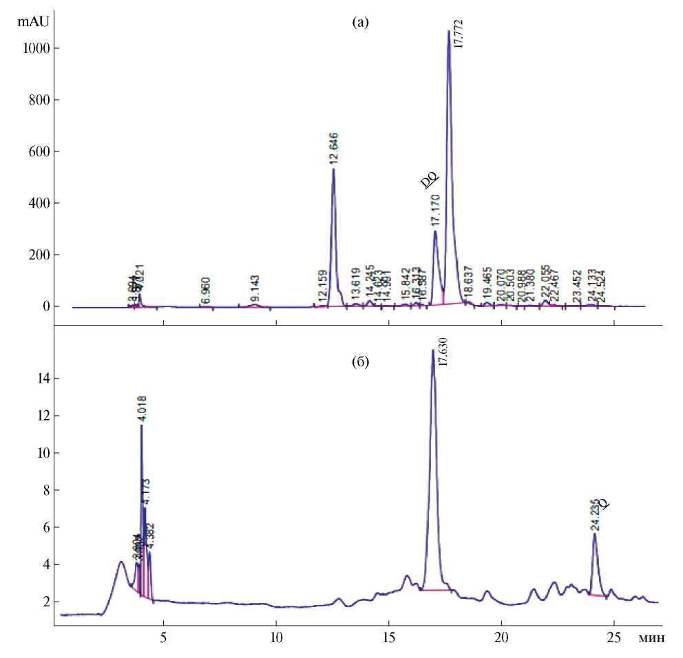Рис. 3. Пример определения дигидрокверцетина (DQ) и кверцетина (Q) в растительном сырье: а – DQ, время выхода – 17.170 мин; б – Q, время выхода – 24.235 мин.