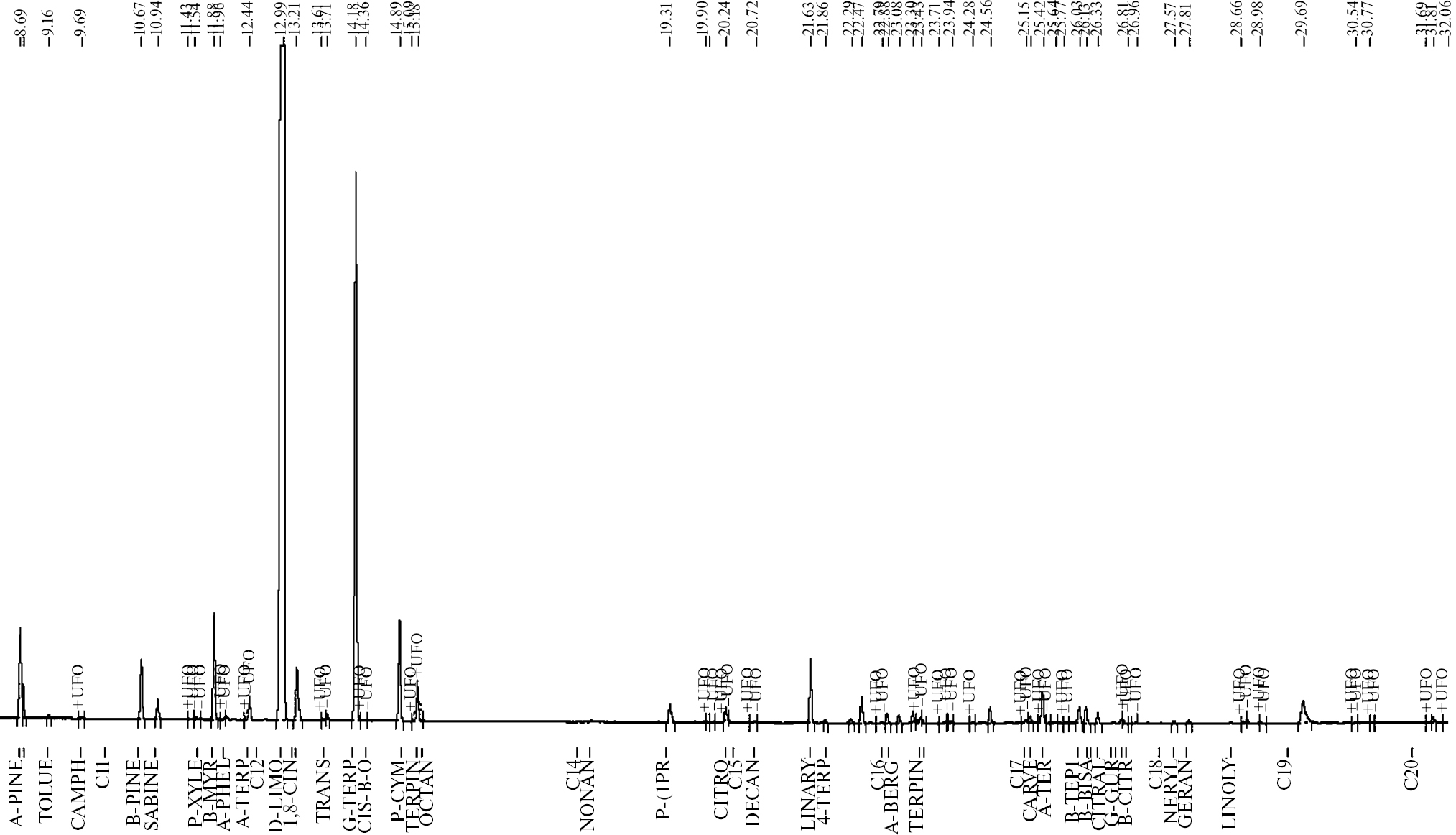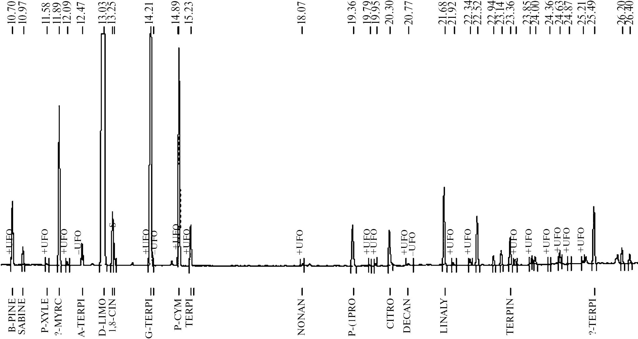 Рис. 3. Хроматограмма эфирного масла кожуры лимона сорта Ташкентский, выращенного в теплице УНПЦ садоводства и овощеводства им. В.И. Эдельштейна (г. Москва).