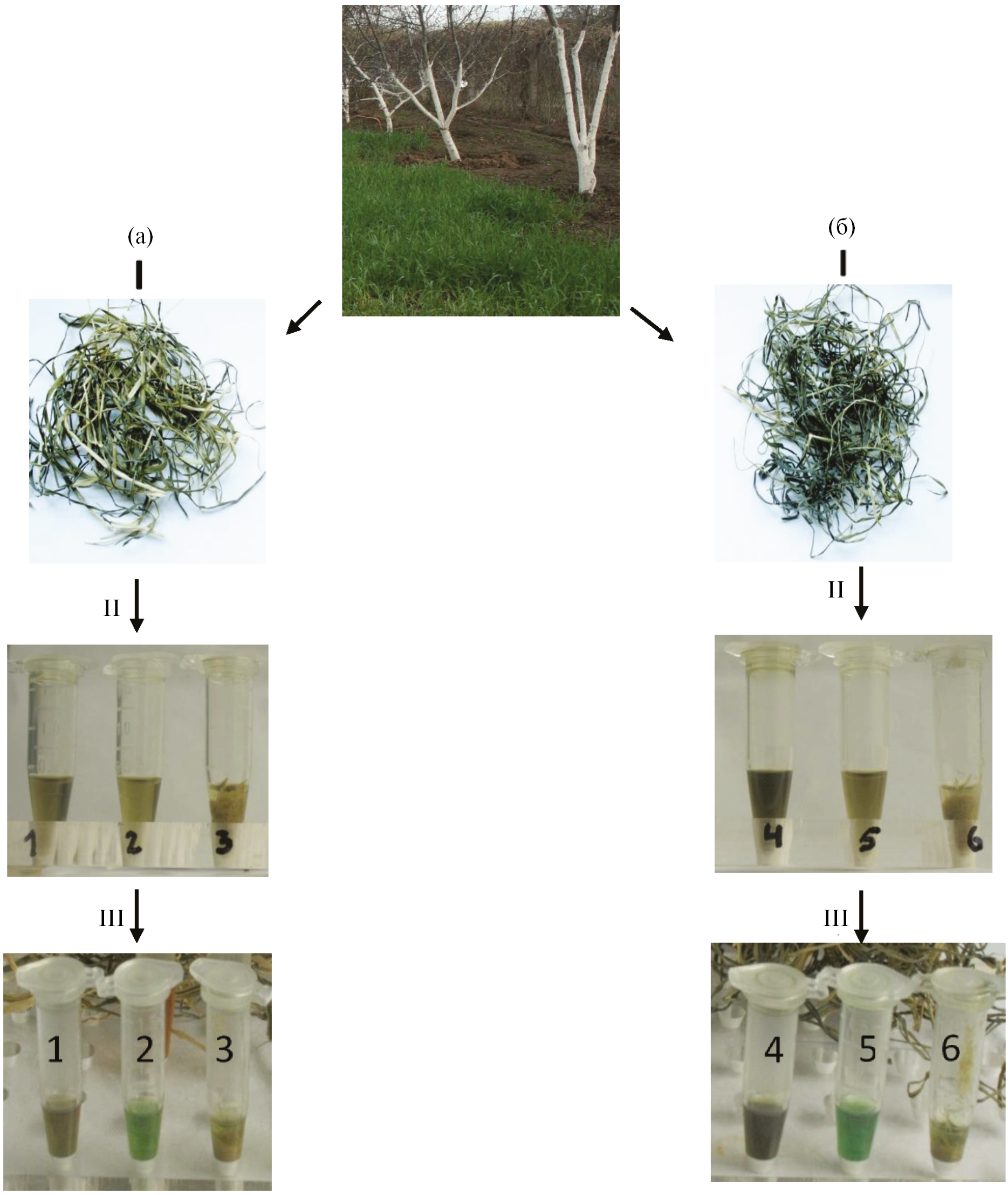 Рис. 1. Схема синтеза Zn-хлорофилла в листьях пшеницы до (I, II) и после реметаллизации с Zn2+ (III) без (а) и при добавлении ЭДТА–Na (б). I – Феофитинизация хлорофиллов инкубацией листьев при рН 3.5–4.0 при перемешивании до смены окраски с зеленой на бурую, отмывка дистиллированной водой до прекращения выхода окрашенных веществ и повышения рН до 5.5–6.5 в среде. II – Металлизация феофитина инкубацией листьев с 100 мМ ZnCl2 при рН 5.5 до прекращения изменения окраски с буро-зеленой на сине-зеленую, отмывка дистиллированной водой, сушка, хранение в темноте, измельчение в блендере, экстракция этанолом, центрифугирование при 5000 g, 5 мин. 1, 4 – этаноловый экстракт листьев пшеницы; 2, 5 – супернатант и осадок после металлизации; 3, 6 – повторная экстракция этанолом осадка после металлизации (2, 5). III – Реметаллизация добавлением 10 мМ ZnCl2 в этаноловый экстракт, инкубация 2 сут, разбавление дистиллированной водой в 10 раз и осаждение Zn-феофитина центрифугированием при 5000 g, 5 мин. 1, 4 – этаноловый экстракт после реметаллизации; 2, 5 – супернатант и осадок после реметаллизации; 3, 6 – повторная экстракция этанолом осадка после реметаллизации (2, 5).