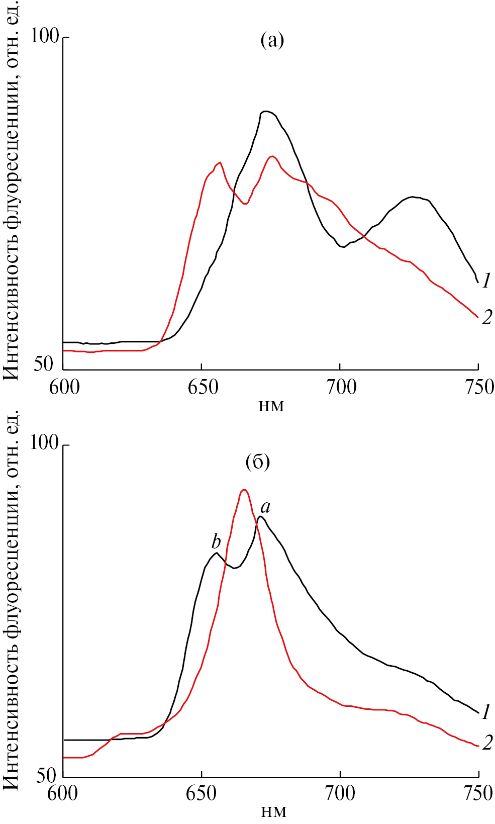 Рис. 2. Спектры флуоресценции при 77 К. (а) – листья пшеницы после феофитинизации (1) и металлизации с ионами Zn2+ (2); (б) – этаноловый экстракт сухих листьев пшеницы до (1) и после повторной металлизации (2). К экстракту добавляли 10 мМ ZnCl2 в этаноле (1), инкубировали 2 сут. при 23°С (2); а – максимум флуоресценции феофитина а; b – максимум флуоресценции феофитина b [19].