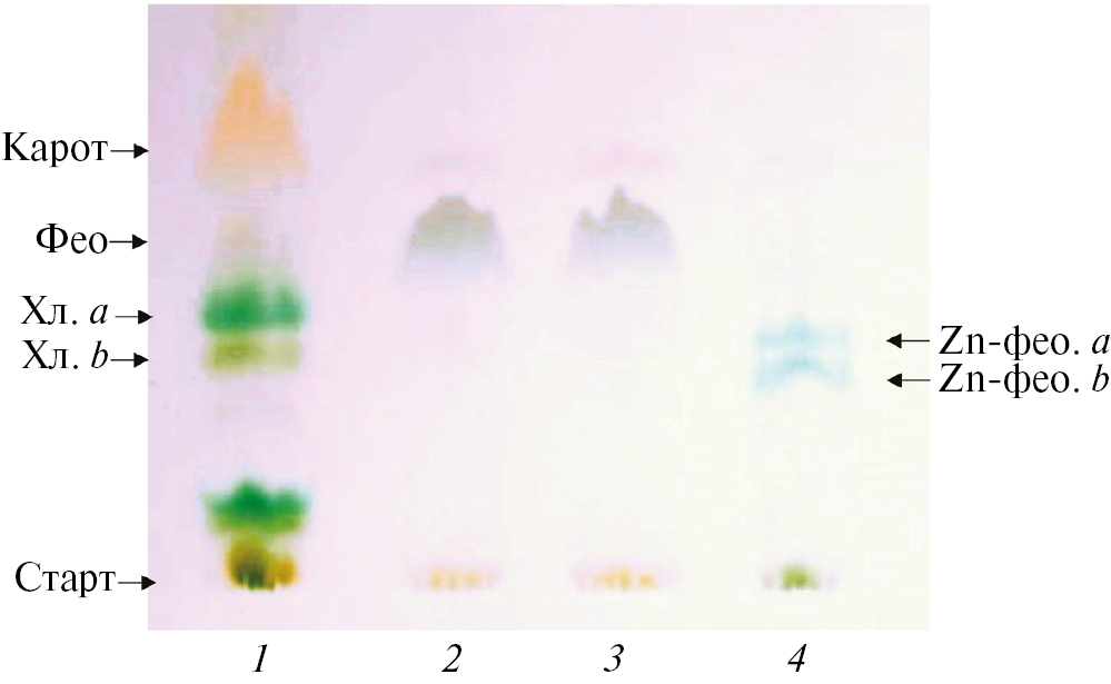 На рис. 3 представлены результаты ТСХ полученных препаратов. На хроматограмме 1 (экстракт сухих листьев) видно присутствие полос хлорофиллов а и b, феофитина а, каротина, на старте видны зоны, в которых находятся ХБК ФС1 и ФС2. Оказалось, что большая часть экстрагированного из листьев феофитина не включала ионы Zn2+, вероятно, из-за неоптимальных условий металлизации, например температуры, рН, недоступности ионов Zn2+ (рис. 3, дорожки 2 и 3). Дополнительная металлизация экстрагированного из листьев феофитина приводила к изменению окраски первого экстракта от буро-зеленой к синей и образованию Zn-феофитина (рис. 3, дорожка 4), имеющего в красной области спектра флуоресценции один максимум (рис. 2б, спектр 2).