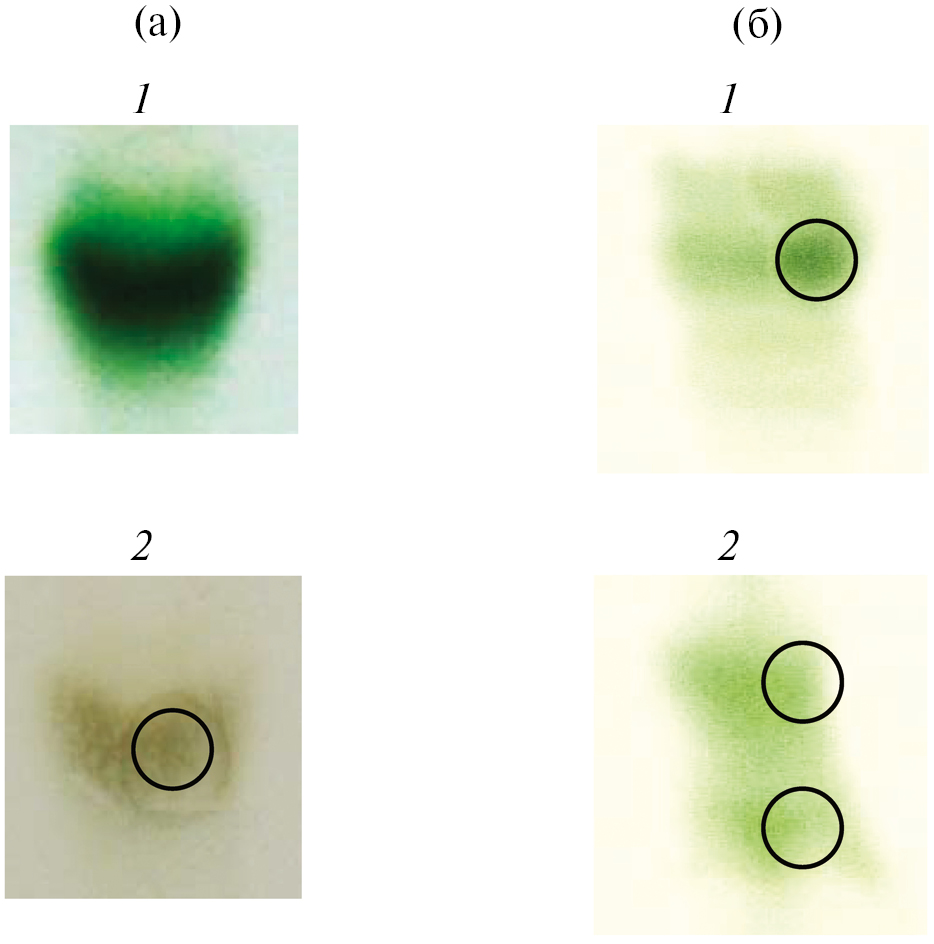 Рис. 4. Включение ионов Zn2+ в феофитин на пластине силикагеля для ТСХ. (а) 1 – зона Хл а + b, сразу после ТСХ, 2 – та же зона Хл а + b после длительного хранения аэробно при комнатной температуре в темноте. На поверхность зоны (обозначена кружком) нанесено 10 мкл 1 М ZnCl2 [17] в спирте. Видно изменение окраски, свидетельствующее о включении Zn2+ в феофитин. (б) – зона феофитина на пластине ТСХ после хроматографии этанолового экстракта листьев пшеницы, инкубированных при рН 4.0 и отмытых с помощью ЭДТА-Na от ионов Mg2+, фенольных веществ. 1 – на участке зоны (обозначена кружком) нанесено 10 мкл 1 М ZnCl2 в спирте, 2 – на участке зоны (обозначена кружком) нанесено 10 мкл 1 М ZnCl2 в воде.