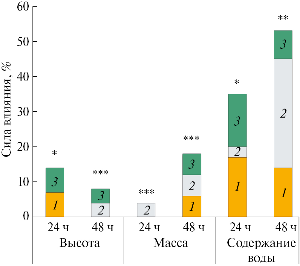 Рис. 1. Результаты двухфакторного дисперсионного анализа высоты, массы и содержания воды в растениях кресс-салата в зависимости от 1 – NaCl-засоления (NaCl), 2 – щелочности (рН) и 3 – взаимного действия этих факторов (NaCl + рН) в условиях солещелочного стресса; влияние факторов значимо: * – при уровне P ≤ 0.015; ** – P ≤ 0.001; *** –P ≤ 0.0001.