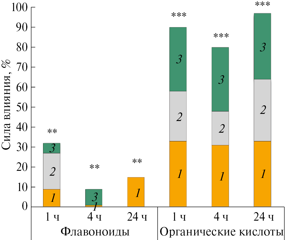 Через 1 ч после стресс-воздействия суммарное влияние показателей стресса на содержание флавоноидов составляло 32%, а наибольшим было воздействие высоких значений рН (рис. 3). В последующий период наблюдений на фоне отсутствия аккумуляции флавоноидов показатели суммарного влияния факторов стресса снизились во второй и третий период наблюдений до 9 и 15% соответственно.