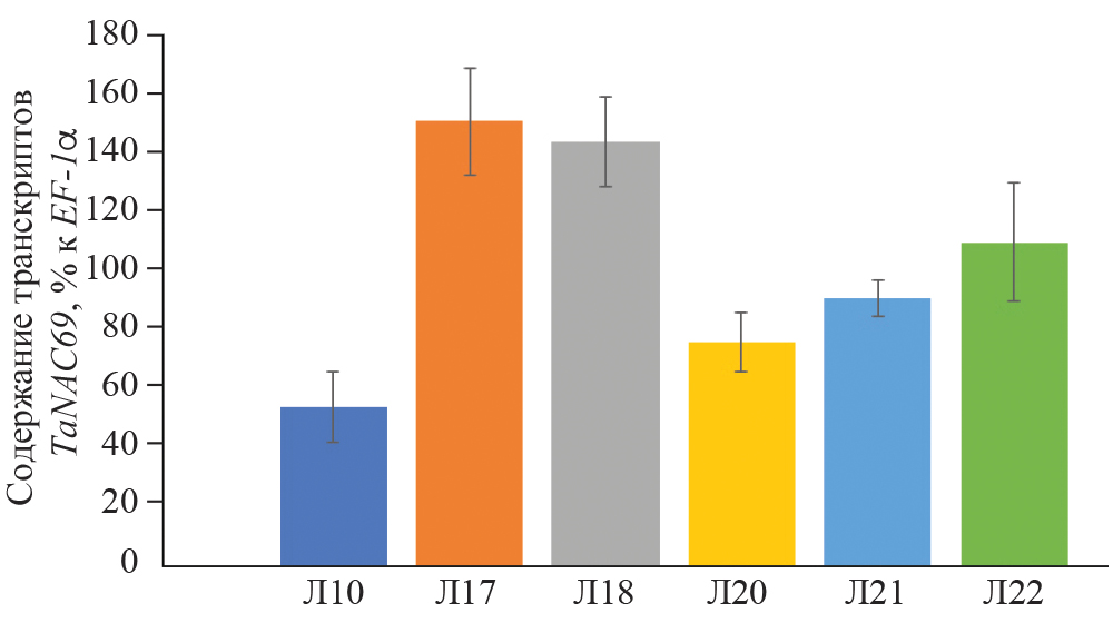 Для получения ВК табака N. tabacum был использован метод агробактериальной трансформации. ВК индуцировали на листовых эксплантах на 10 сут. после инокуляции агробактериями. Для селекции трансгенных ВК добавляли в МС-среду гигромицин B. При прорастании на 1.5–2 см, ВК отделяли от первичного экспланта и пересаживали на МС-среду без добавления фитогормонов. Биомассу корней наращивали в течение 2 нед., после чего проводили ПЦР-анализ на наличие целевого (TaNAC69), селективного (HPT) и репортерного (uidA) генов. Также с использованием метода ПЦР с праймерами ArhizF/ArhizR исключали ВК, несущие агробактериальную контаминацию. В результате было отобрано 6 линий трансгенных корней, содержащих все три анализируемых гена, которые получили номера 10, 17, 18, 20, 21 и 22. Далее в этих линиях корней было определено содержание транскриптов гена TaNAC69 по отношению к содержанию транскриптов гена EF-1α. По содержанию транскриптов целевого гена линии ВК табака составили следующий ряд: Л17 > Л18 > Л22 > Л21> > Л20 > Л10 (рис. 1), в котором наибольший уровень экспрессии целевого гена был характерен для линии 17, а наименьший для линии 10.