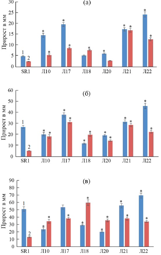 Рис. 3. Средний прирост ВК табака при норме и действии 150 мМ NaCl: (а) – через 10 сут. после начала опыта; (б) – через 20 сут. после начала опыта; (в) – через 30 сут. после начала опыта. 1 – при нормальных условиях, 2 – при действии 150 мМ NaCl. Звездочки (*) указывают на достоверное различие данных между трансгенными и контрольной линиями ВК (P ≤ 0.05).