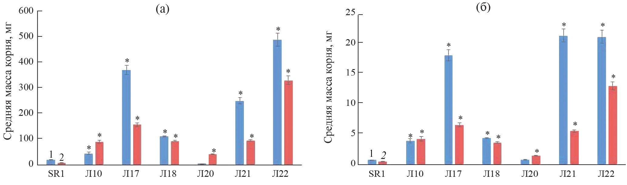 Рис. 4. Сырая (а) и сухая (б) масса волосовидных корней при норме и действии 150 мМ NaCl. 1 – при нормальных условиях, 2 – при действии 150 мМ NaCl. Звездочки (*) указывают на достоверное различие данных между трансгенными и контрольной линиями ВК (P ≤ 0.05).